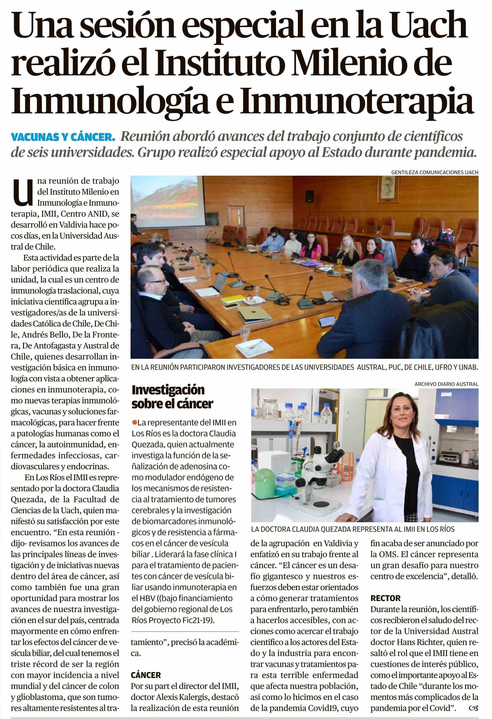 Una sesión especial en la Uach realizó el Instituto Milenio de Inmunología e Inmunoterapia 21-05-2023 Diario Austral Región de Los Ríos |