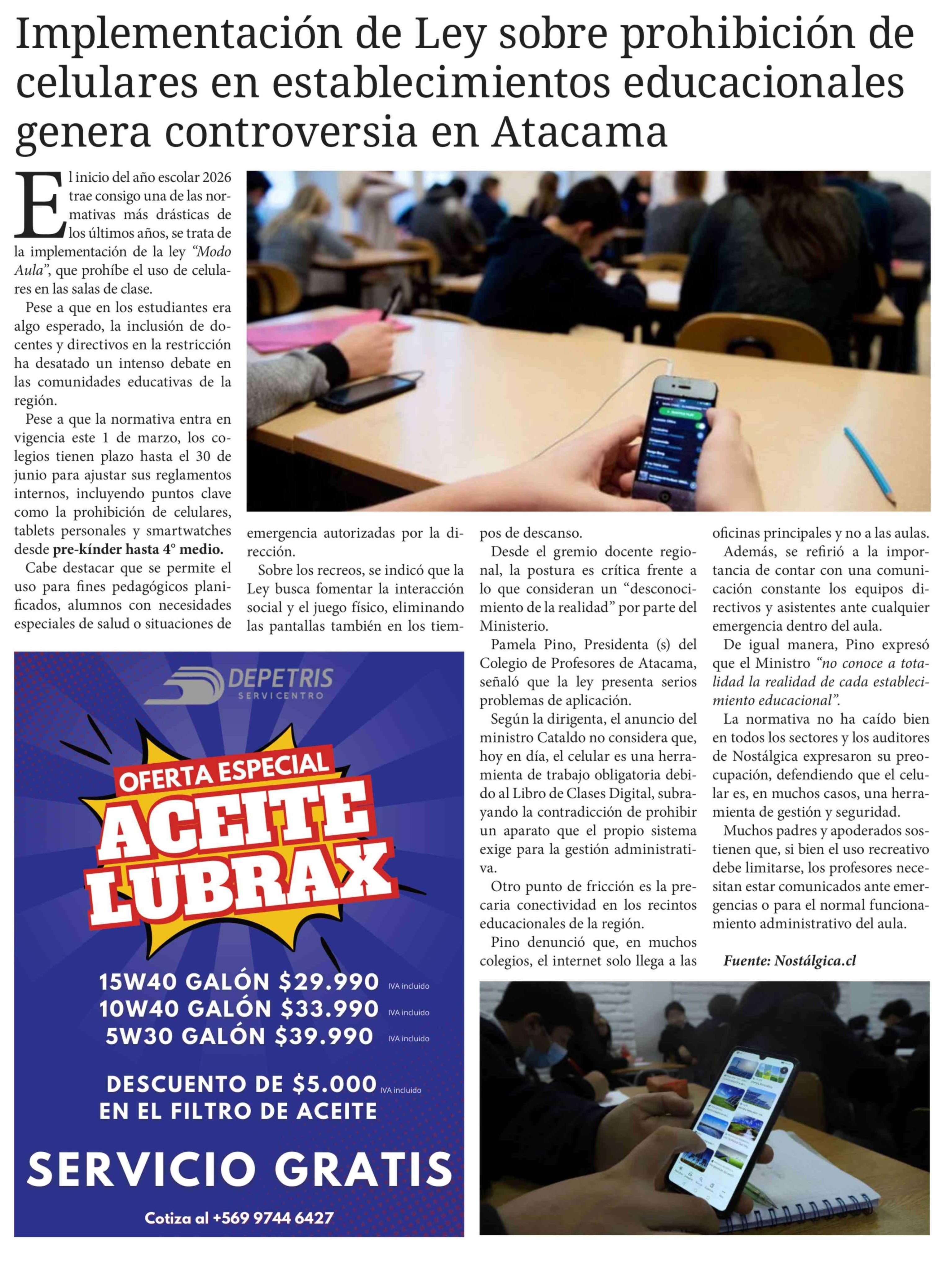 Implementación de Ley sobre prohibición de celulares en establecimientos educacionales genera controversia en Atacama 22-02-2026 Diario Chañarcillo |