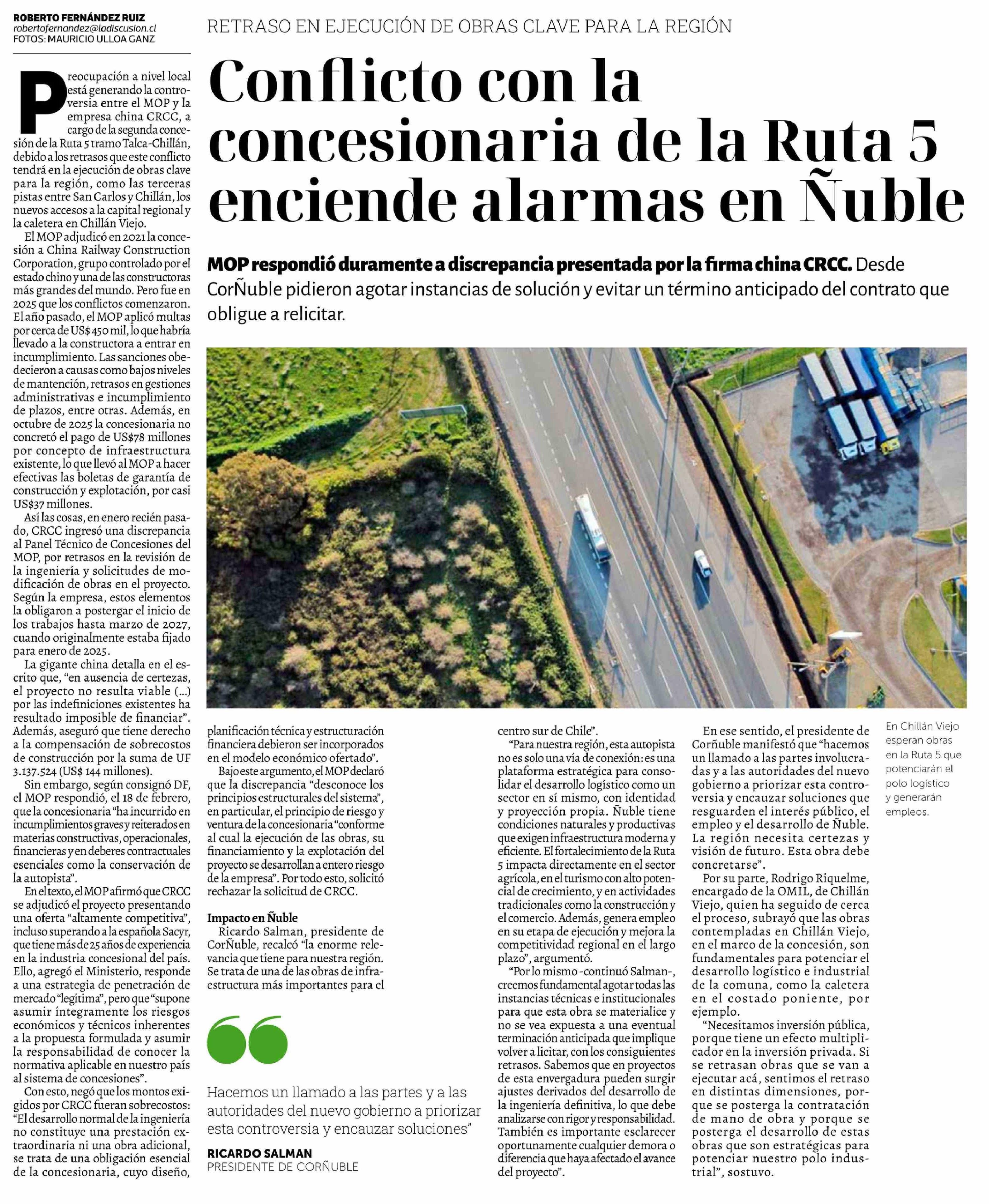 Conflicto con la concesionaria de la Ruta 5 enciende alarmas en Ñuble 26-02-2026 La Discusión |