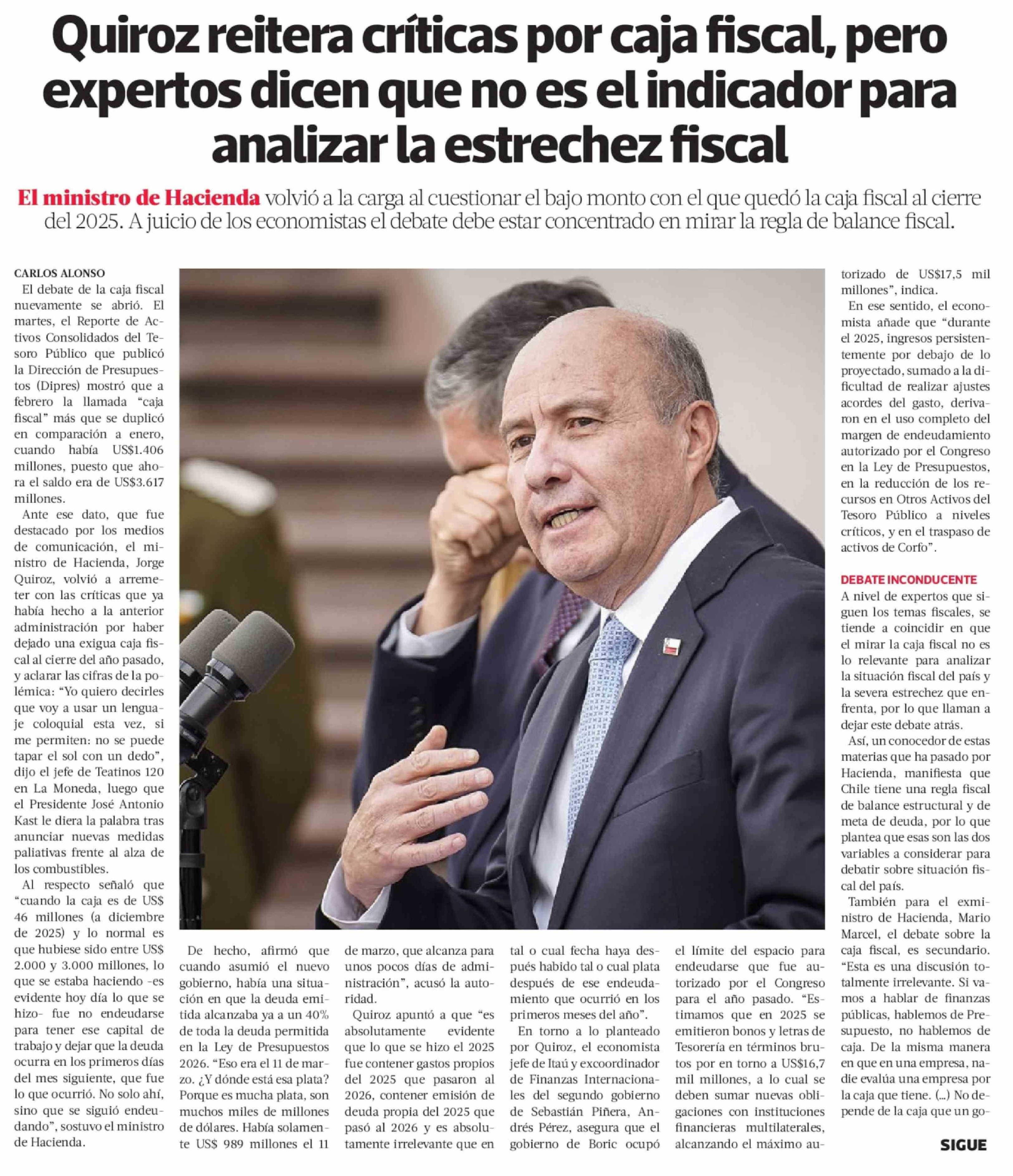 Quiroz reitera críticas por caja fiscal, pero expertos dicen que no es el indicador para analizar la estrechez fiscal 02-04-2026 La Tercera |