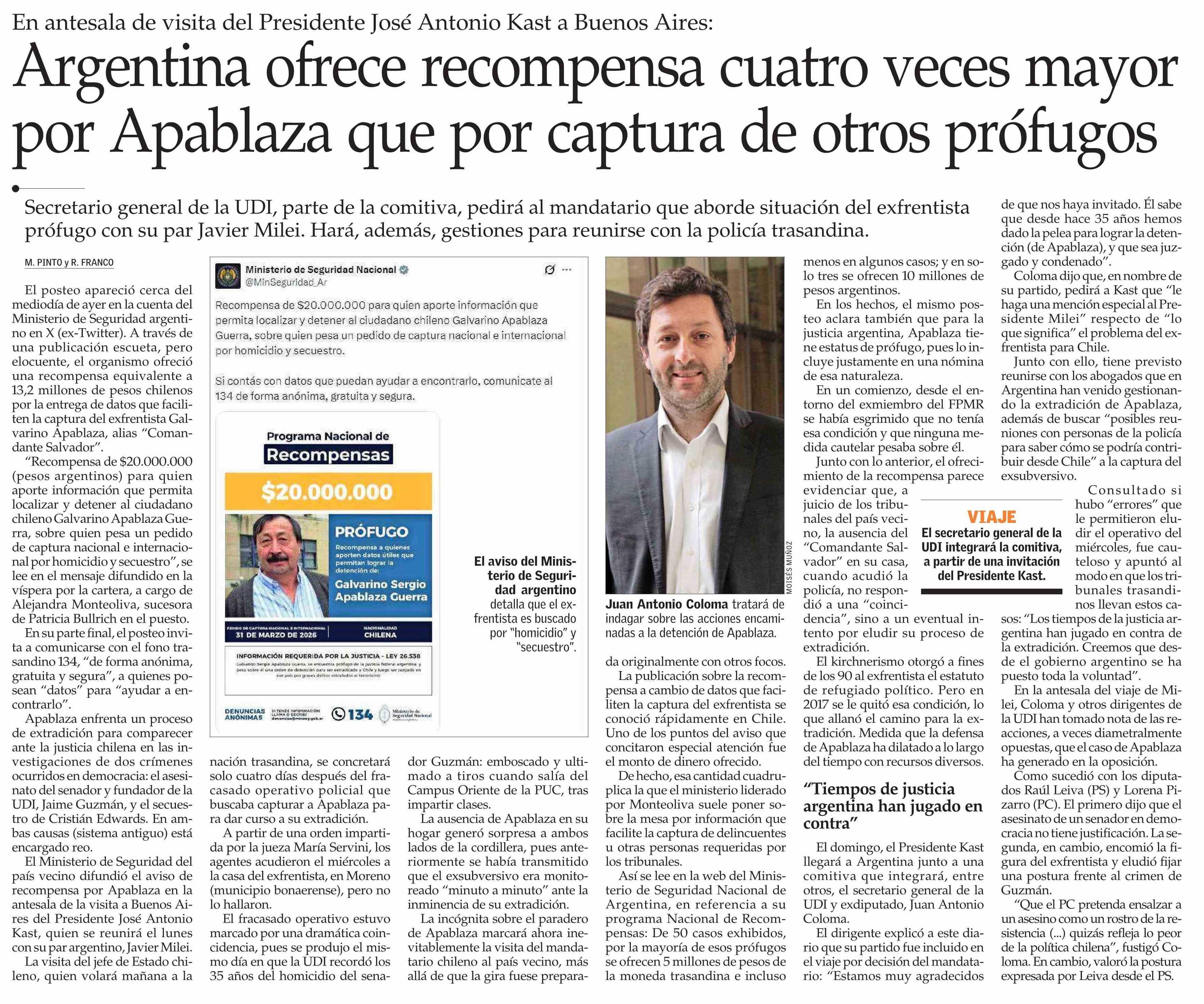 Argentina ofrece recompensa cuatro veces mayor por Apablaza que por captura de otros prófugos 04-04-2026 El Mercurio |