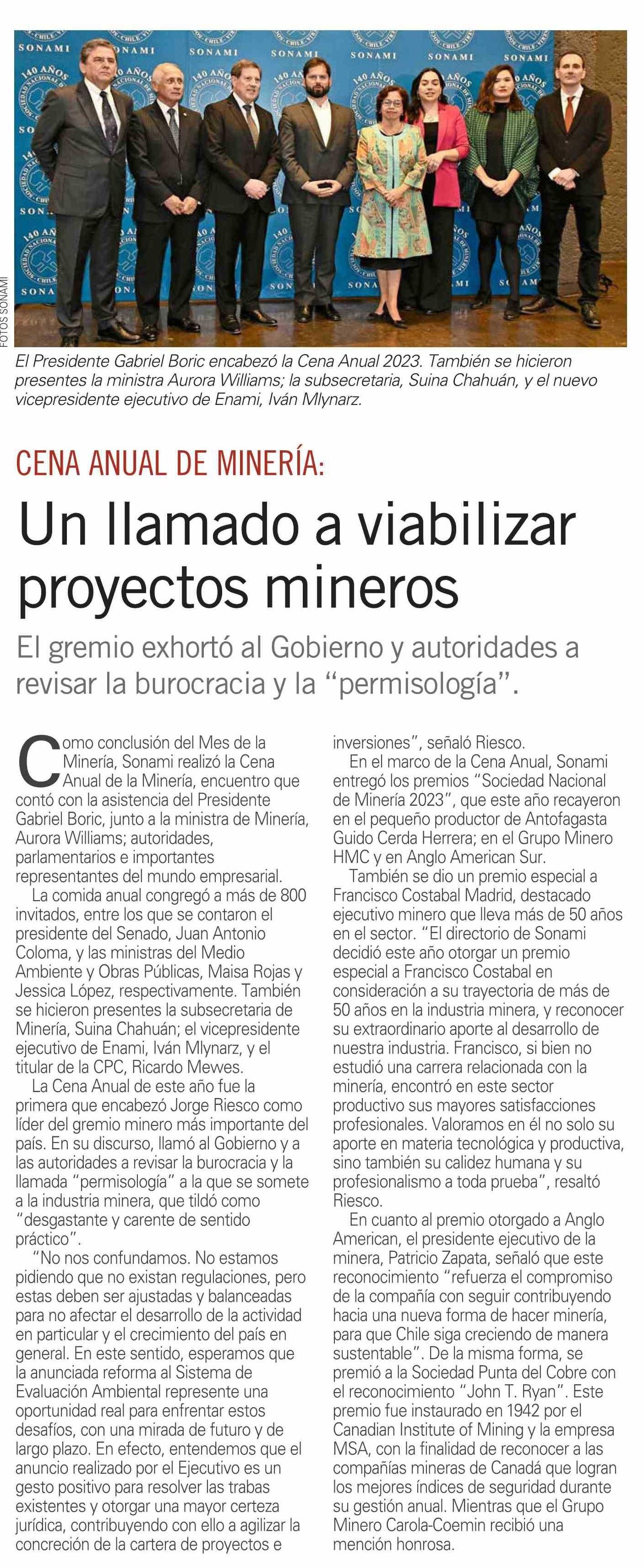 Un llamado a viabilizar proyectos mineros 29-09-2023 El Mercurio |