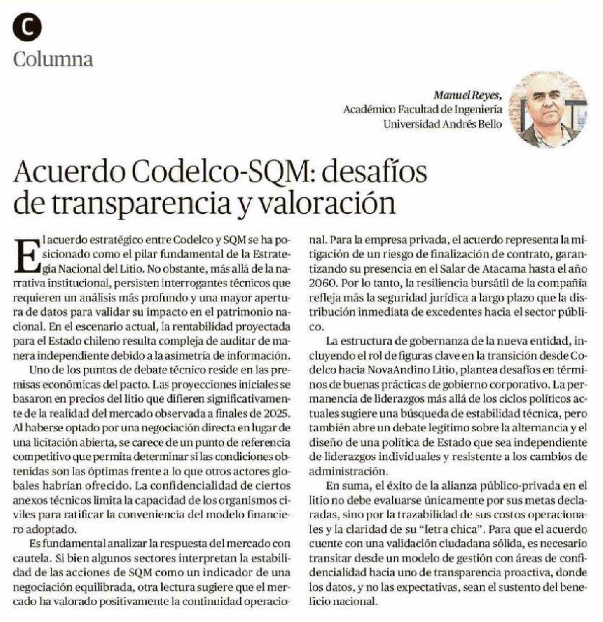 Título: Columnas de Opinión: Acuerdo Codelco-SQM: desafíos de transparencia y valoración