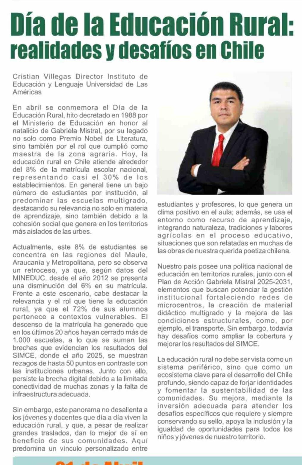 Columnas de Opinión: Día de la Educación Rural: realidades y desafíos en Chile 21-04-2026 El Labrador |