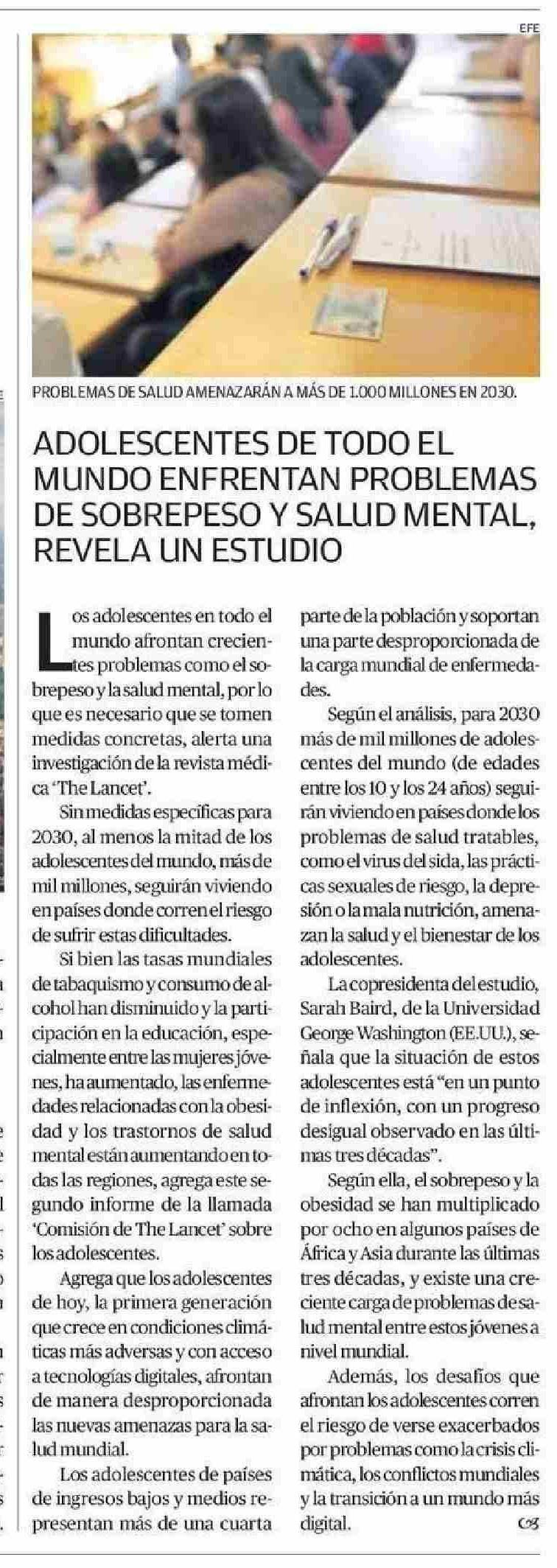 ADOLESCENTES DE TODO EL MUNDO ENFRENTAN PROBLEMAS DE SOBREPESO Y SALUD MENTAL, REVELA UN ESTUDIO 07-06-2025 El Mercurio de Calama |