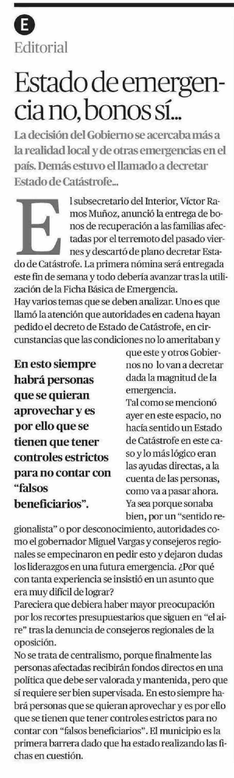 Editorial: Estado de emergencia no, bonos sí ... 12-06-2025 El Diario de Atacama |