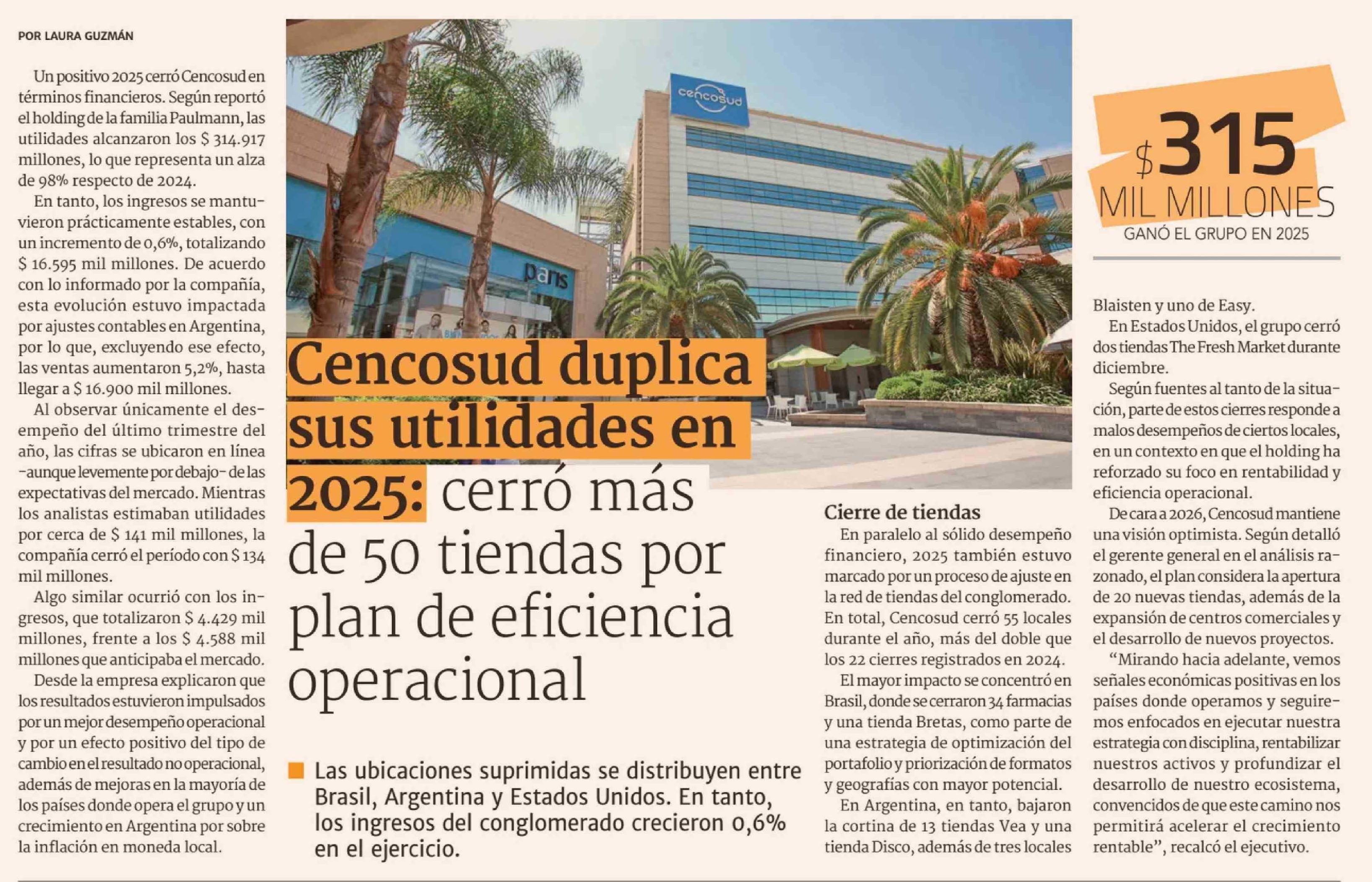 | Título: | Cencosud duplica sus utilidades en 2025: cerró más de 50 tiendas por plan de eficiencia operacional |