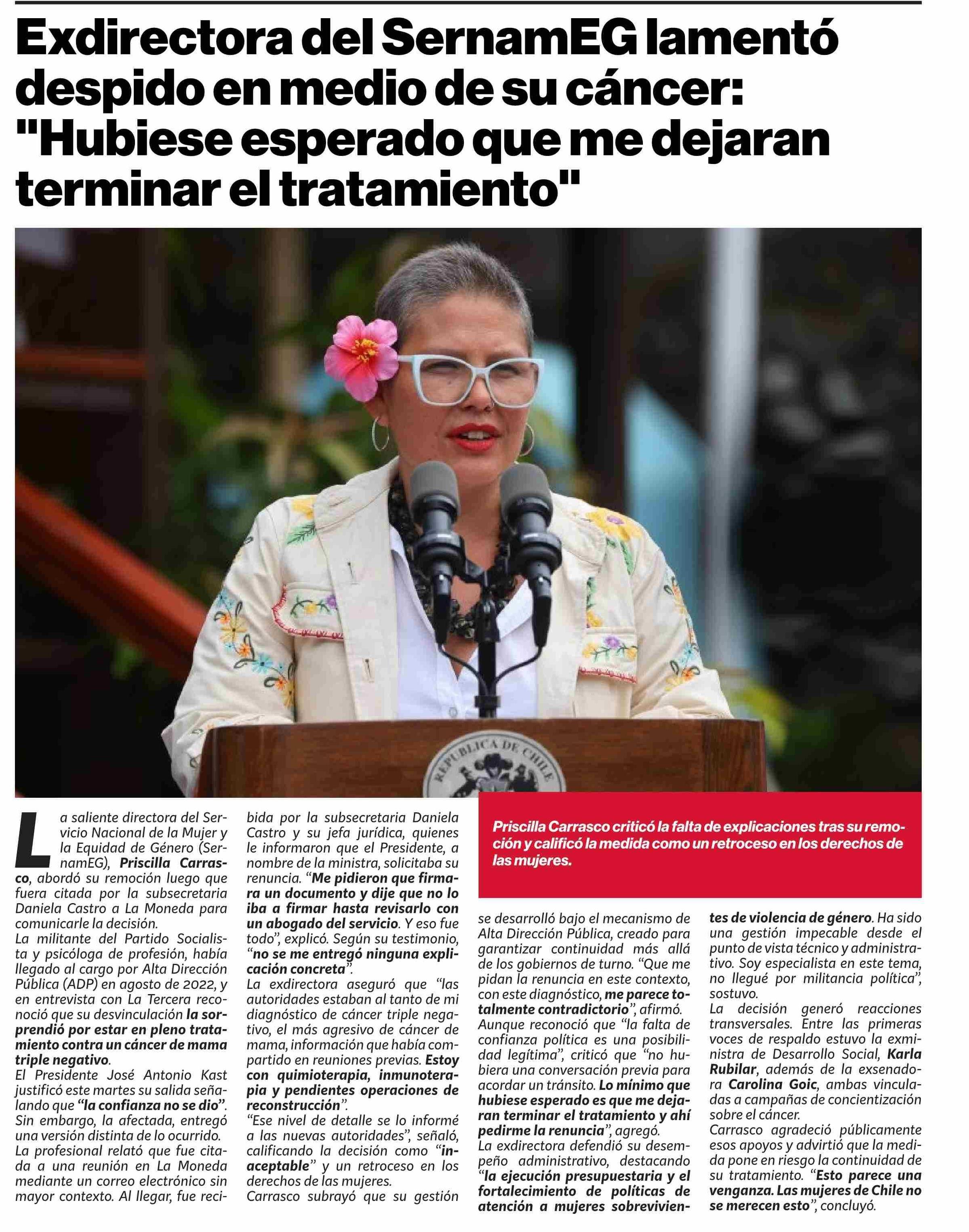 Título: Exdirectora del SernamEG lamentó despido en medio de su cáncer: "Hubiese esperado que me dejaran terminar el tratamiento”