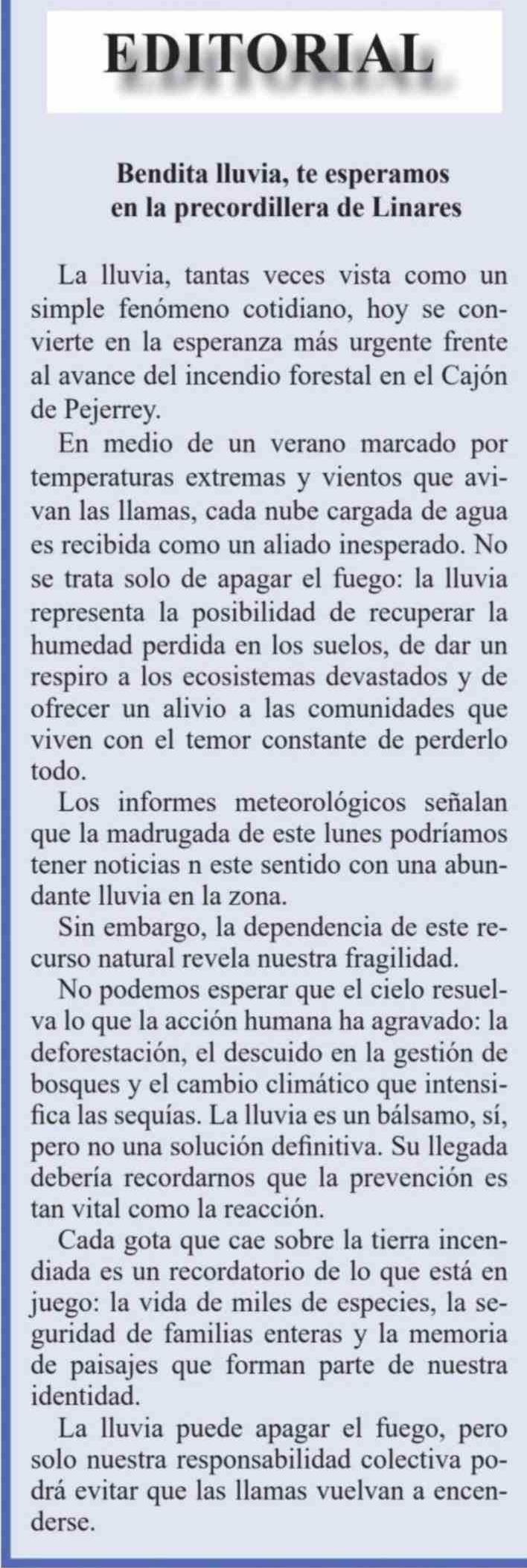 Editorial: Bendita lluvia, te esperamos en la precordillera de Linares 28-02-2026 El Heraldo |