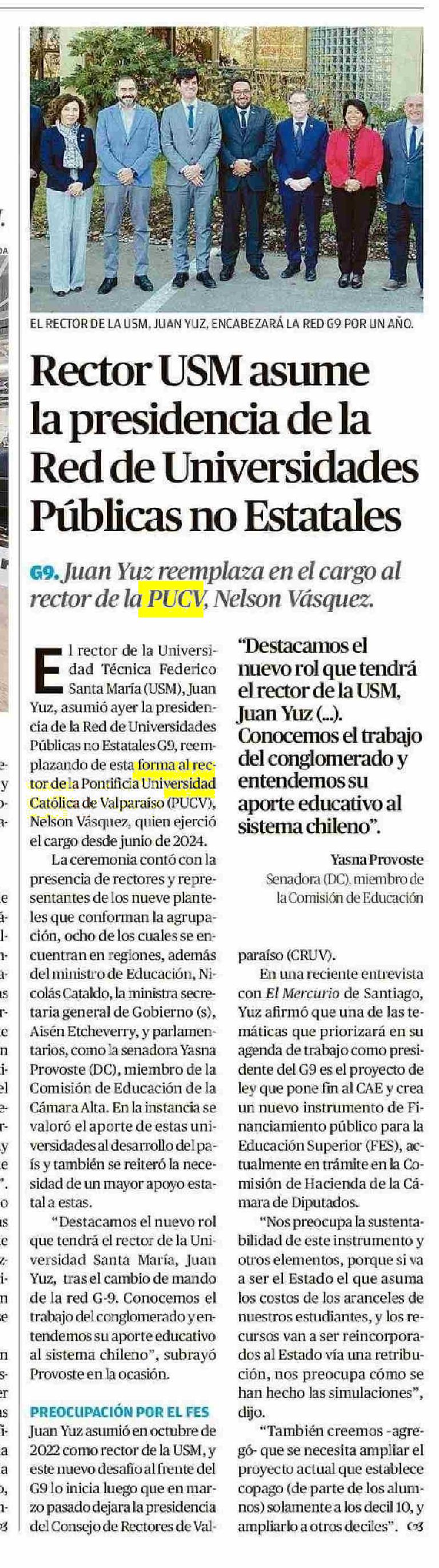 Rector USM asume la presidencia de la Públicas no Estatales Red de Universidades 10-06-2025 El Mercurio de Valparaíso |