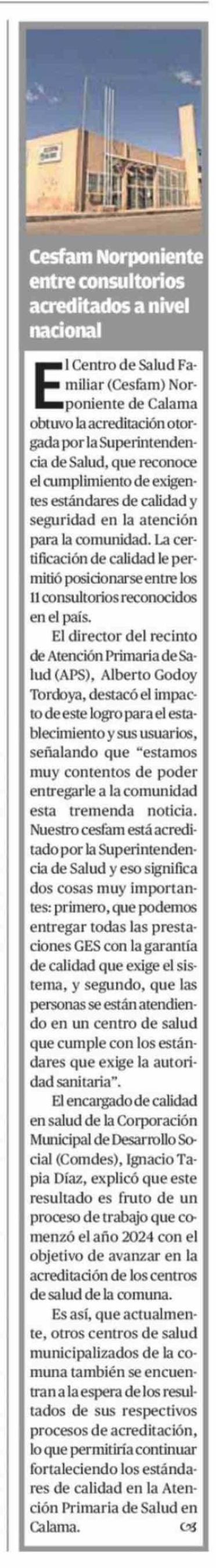 Cesfam Norponiente entre consultorios acreditados a nivel nacional l Centro de Salud Fa- 18-03-2026 El Mercurio de Calama |