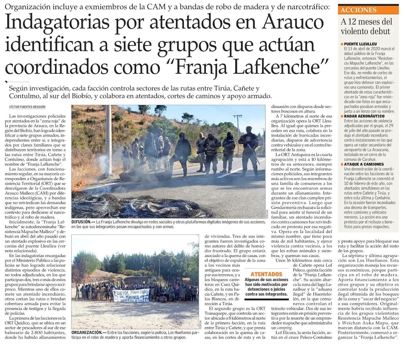 Indagatorias por atentados en Arauco identifican a siete grupos que actúan coordinados como “Franja Lafkenche” 25-04-2021 El Mercurio |
