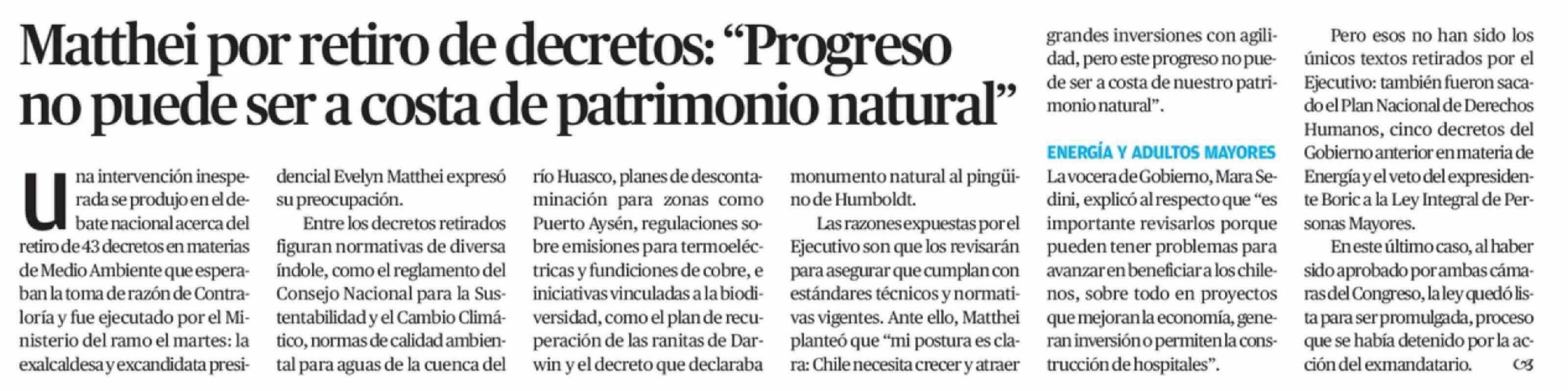 Título: Matthei por retiro de decretos: "Progreso no puede ser a costa de patrimonio natural"