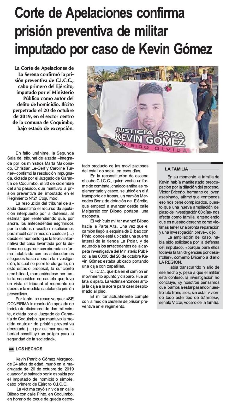 Corte de Apelaciones confirma prisión preventiva de militar imputado por caso de Kevin Gómez 19-01-2021 Diario la Región |