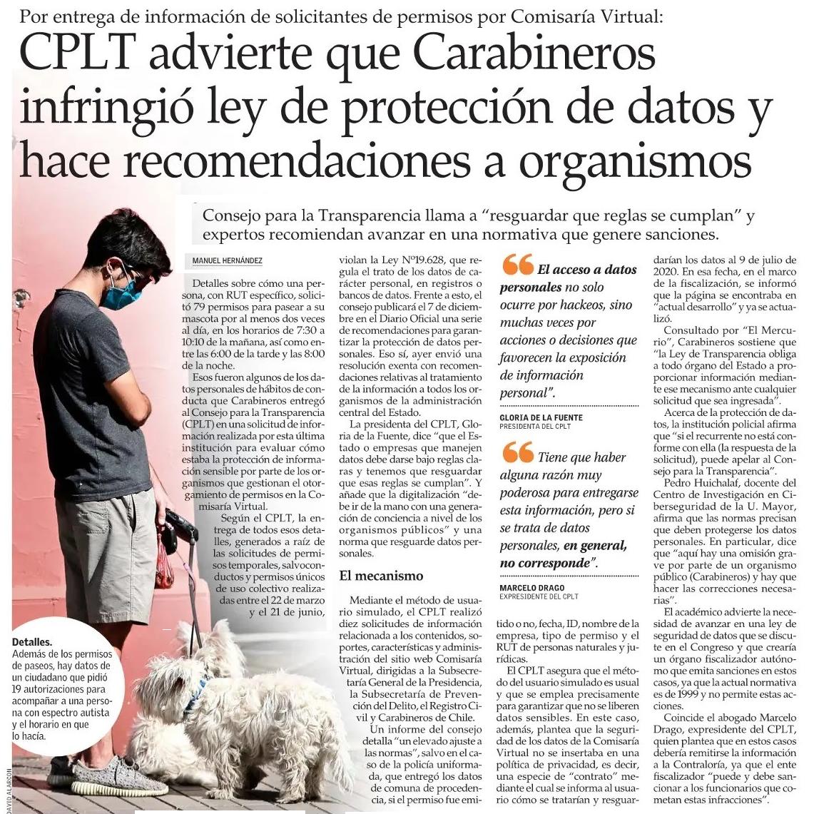 CPLT advierte que Carabineros infringió ley de protección de datos y hace recomendaciones a organismos 04-12-2020 El Mercurio |