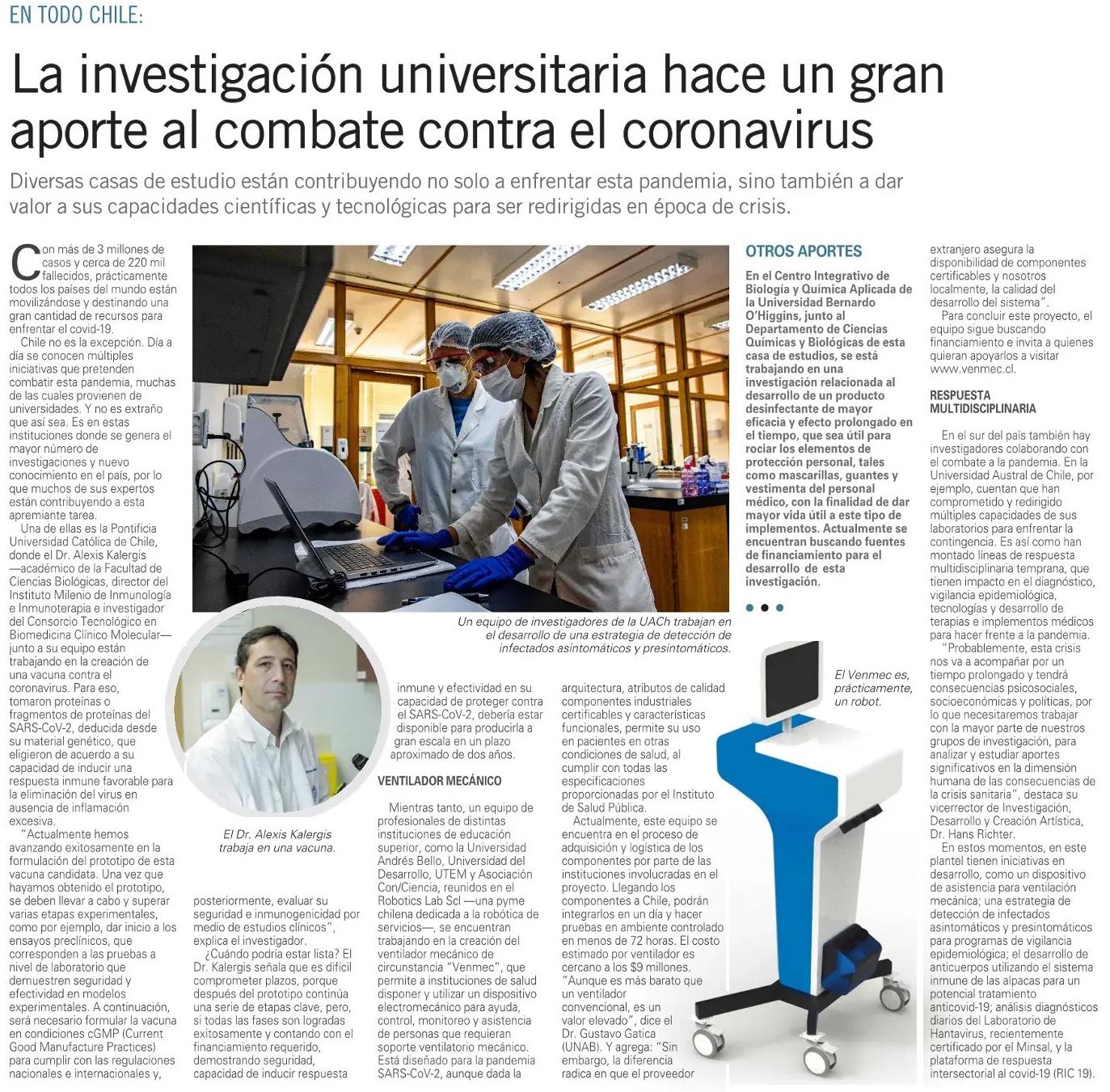 La investigación universitaria hace un gran aporte al combate contra el coronavirus 30-04-2020 El Mercurio |