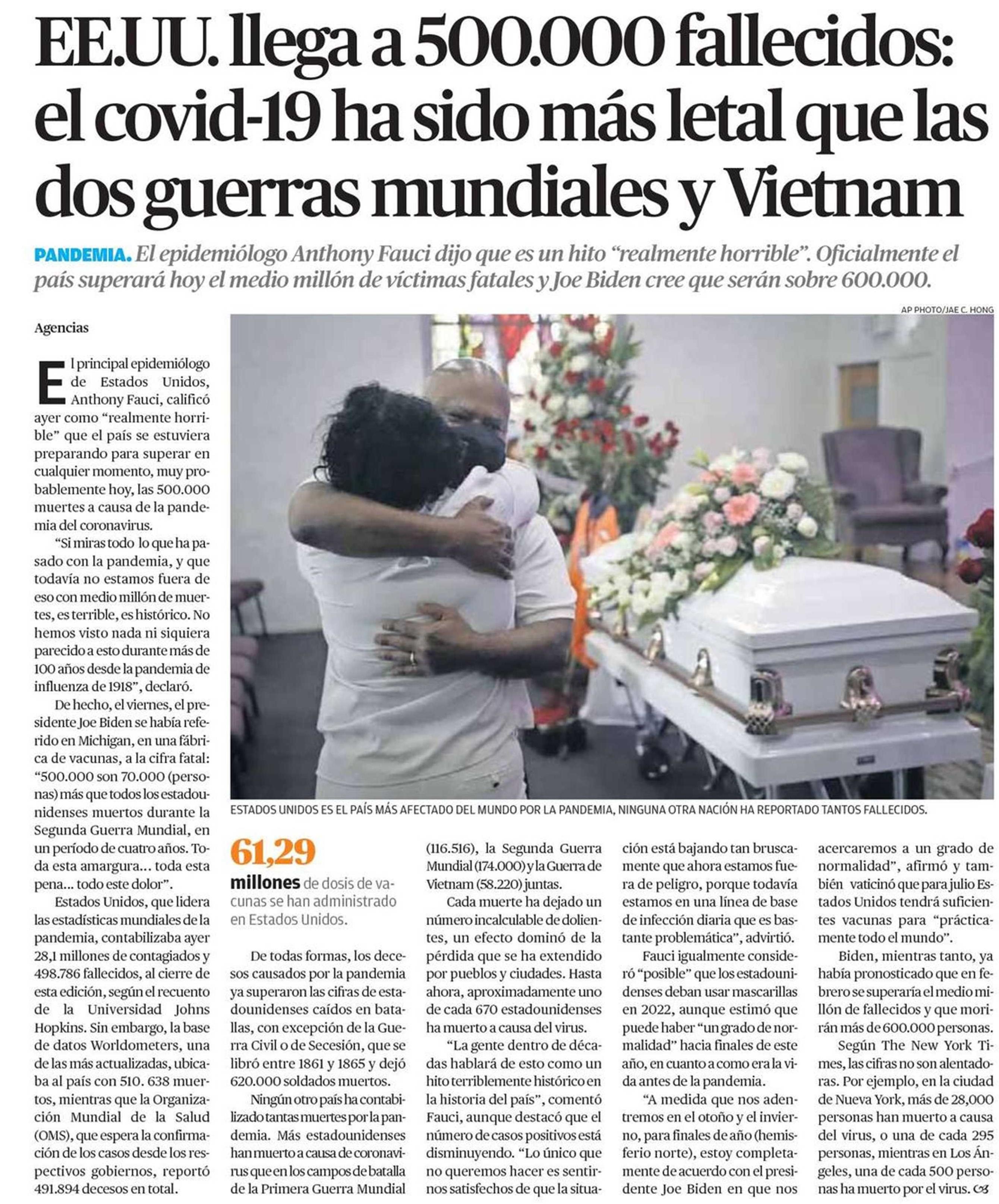 EEUU. llega a 500.000 fallecidos: el covid-19 ha sido más letal que las dos guerras mundiales y Vietnam 22-02-2021 El Mercurio de Calama |