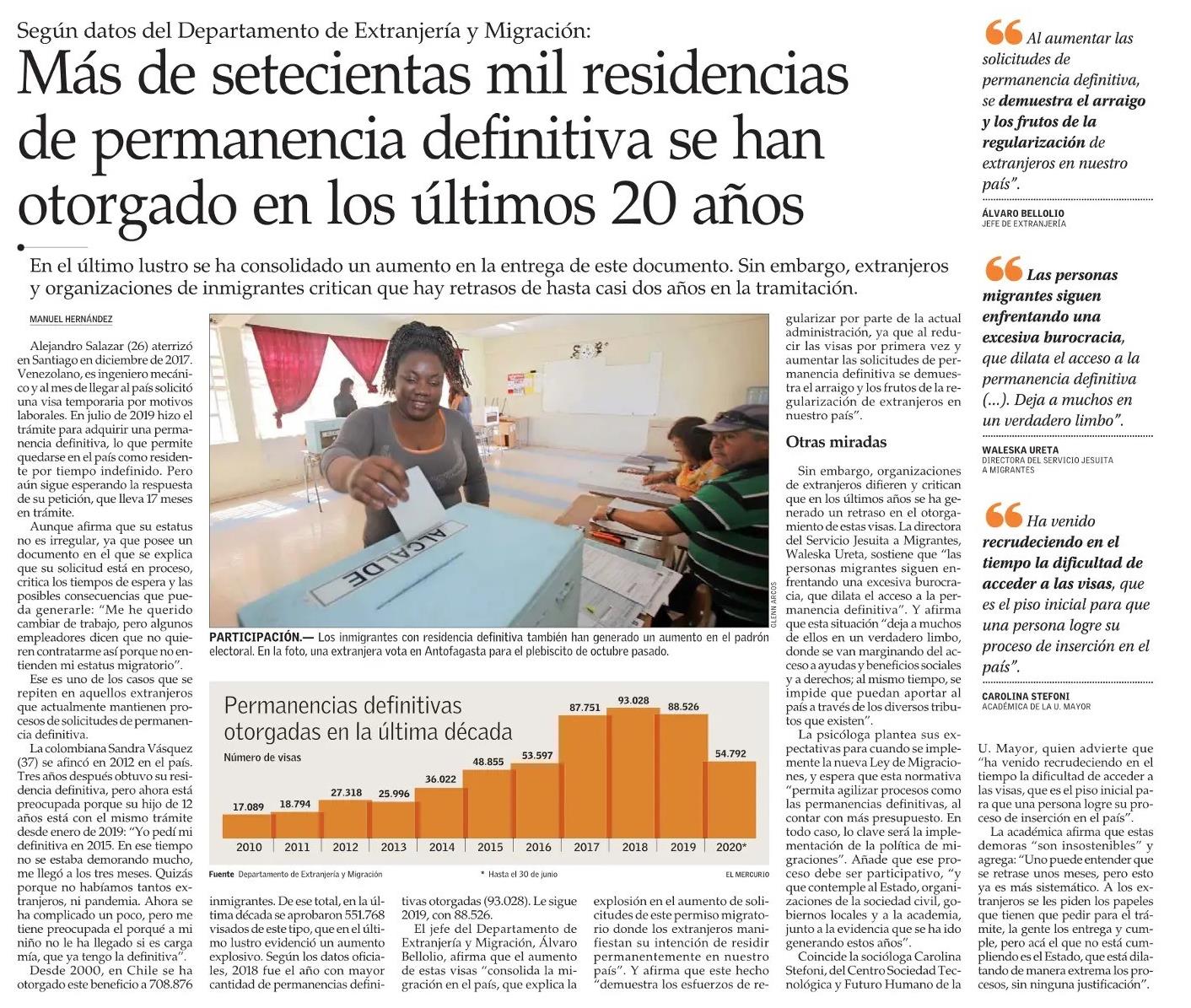 Más de setecientas mil residencias de permanencia definitiva se han otorgado en los últimos 20 años 20-12-2020 El Mercurio |