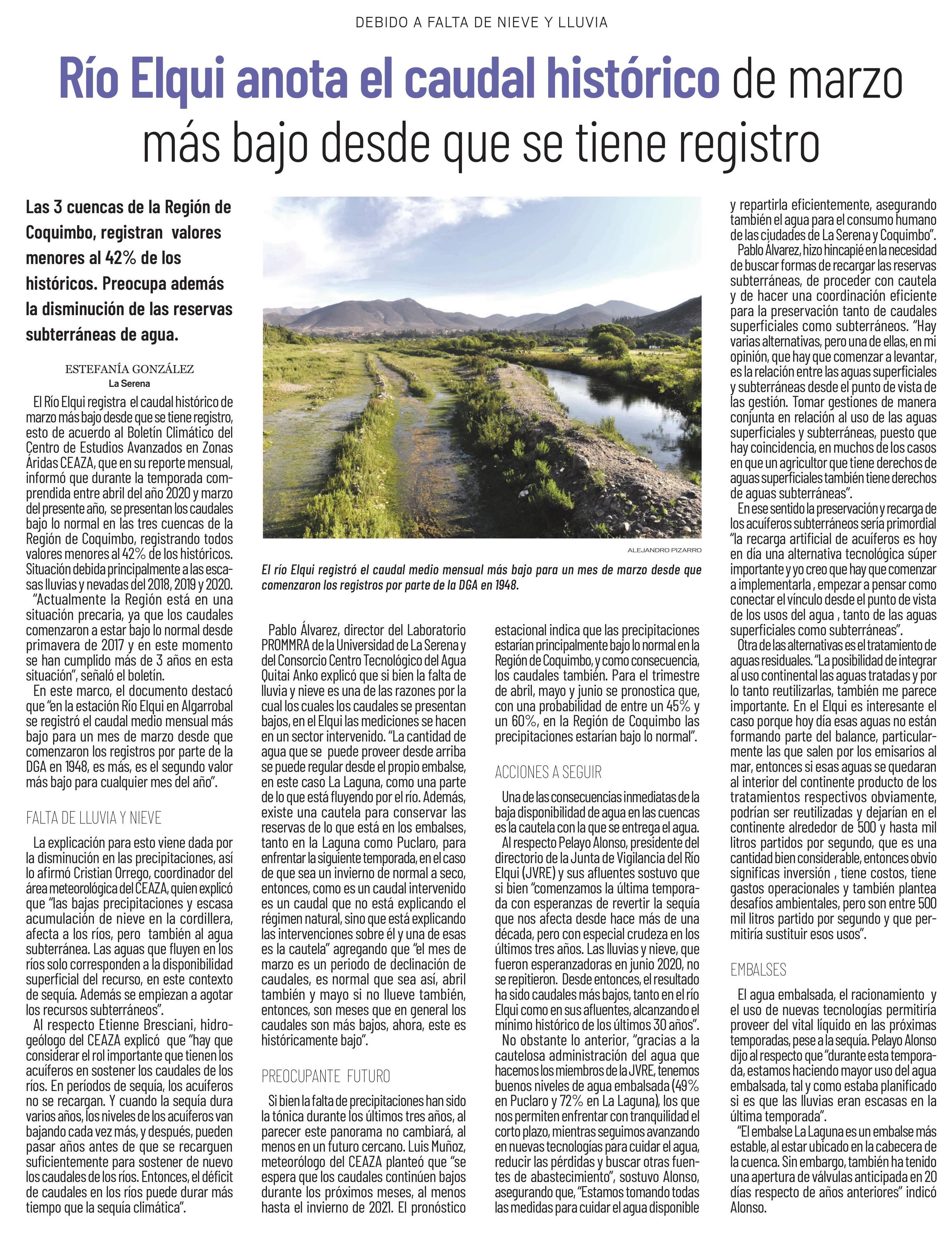 Río Elqui anota el caudal histórico de marzo más bajo desde que se tiene registro 18-04-2021 El Ovallino |