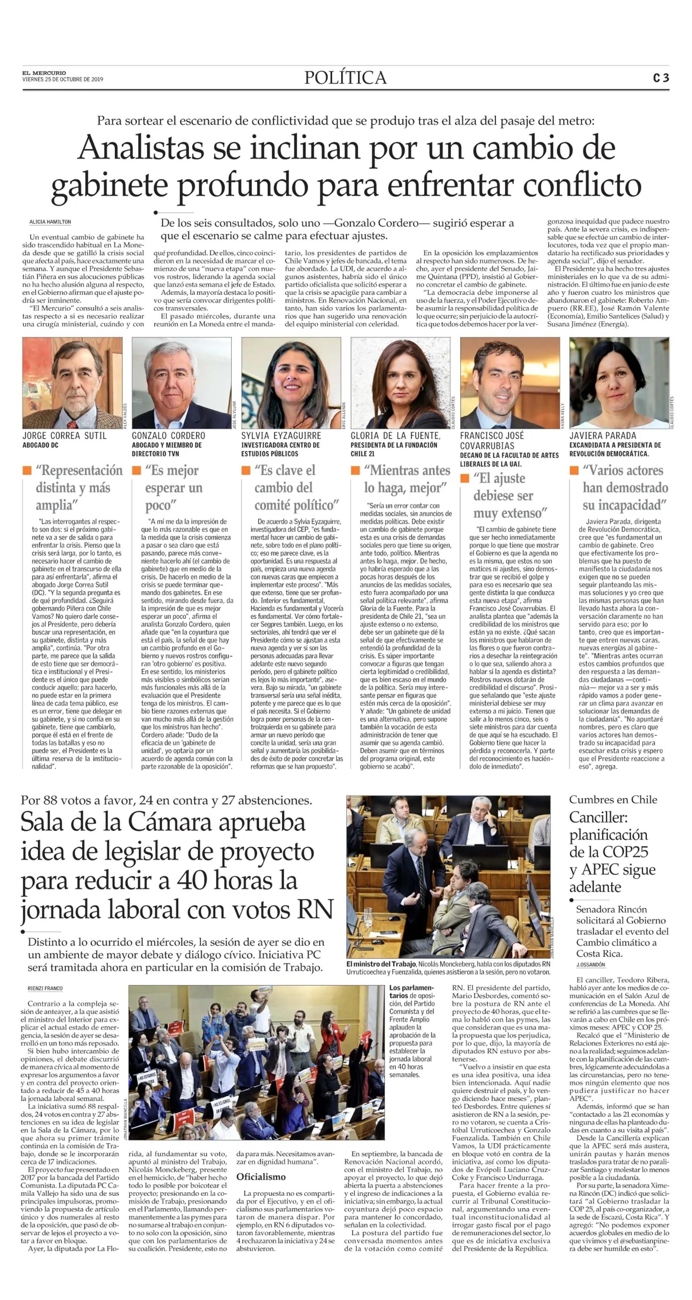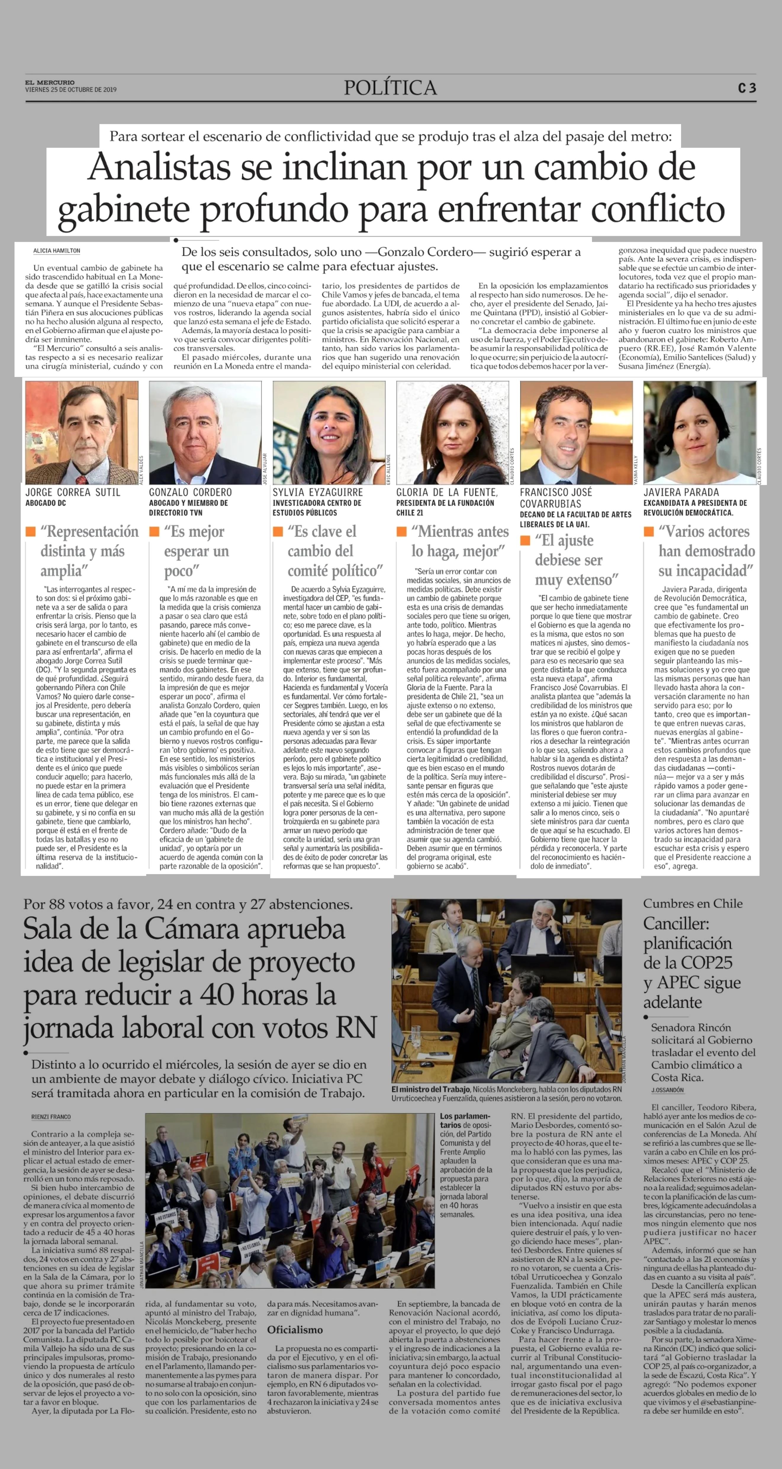 Analistas se inclinan por un cambio de gabinete profundo para enfrentar conflicto 25/10/2019 El Mercurio Para sortear el escenario de conflictividad que se produjo tras el alza del pasaje del metro: Analistas se inclinan por un cambio de gabinete profundo para enfrentar conflicto . De... |