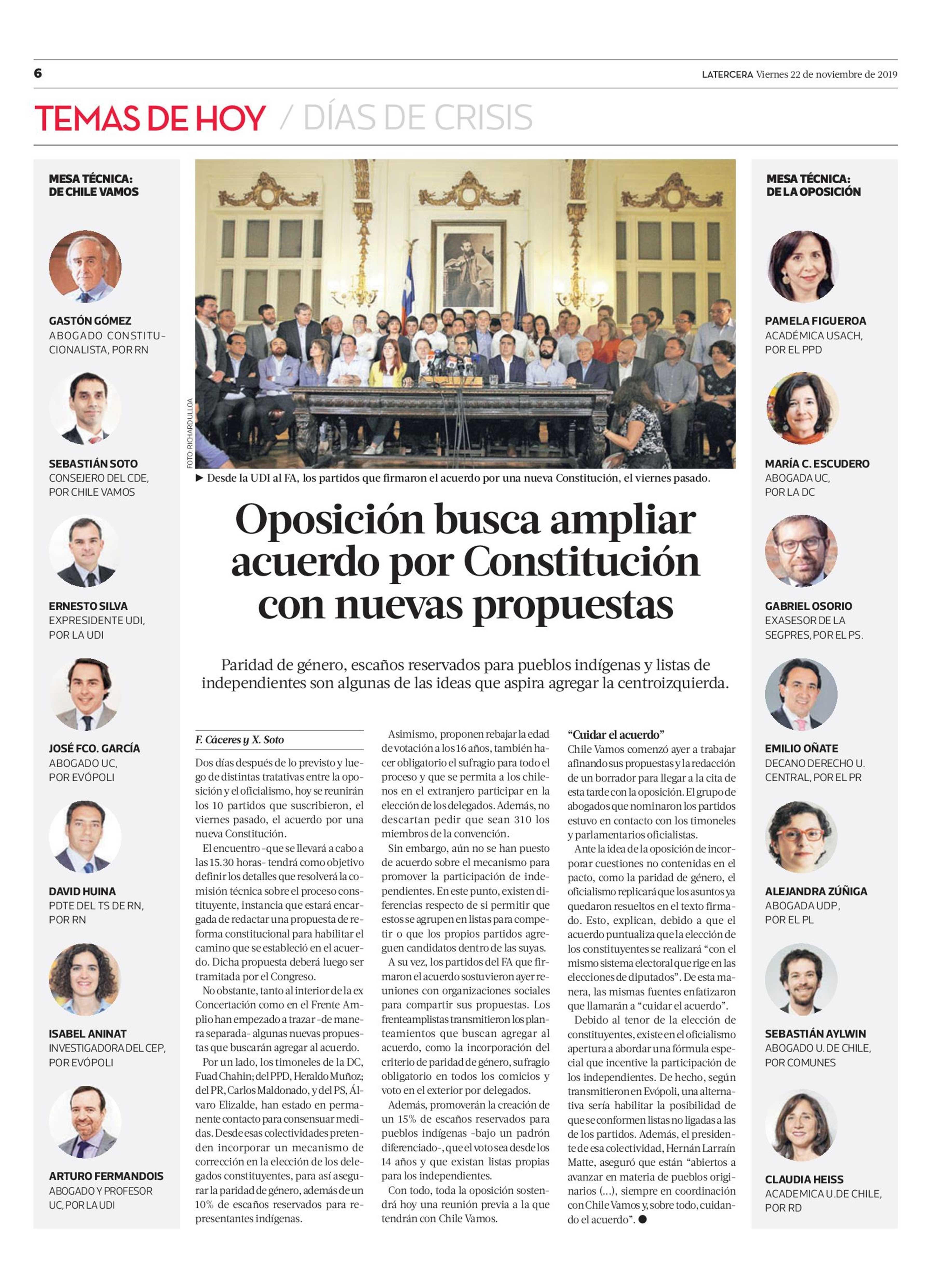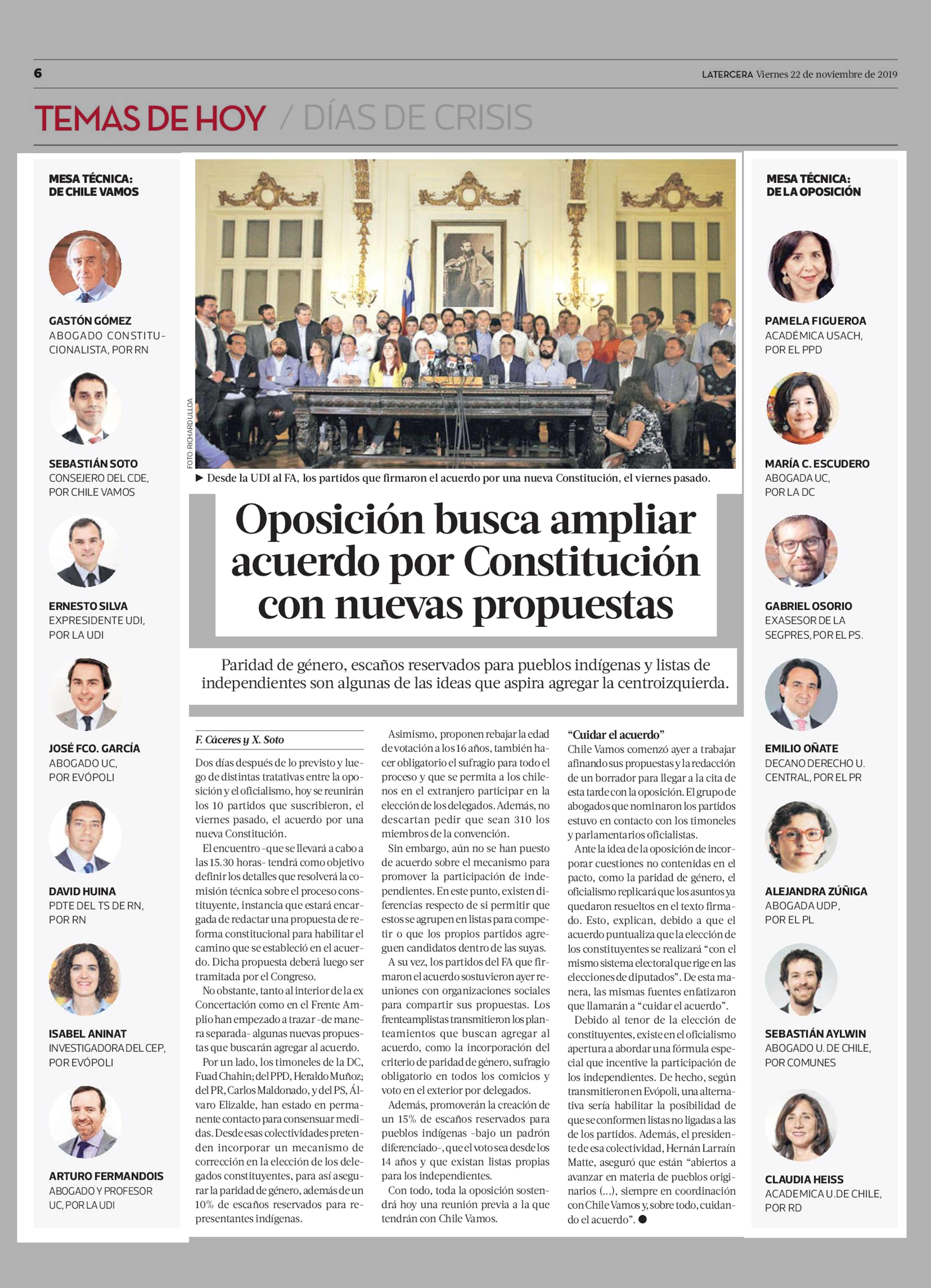 Oposición busca ampliar acuerdo por Constitución con nuevas propuestas 22/11/2019 La Tercera Oposición busca ampliar acuerdo por Constitución con nuevas propuestas Paridad de género, escaños reservados para pueblos indígenas y listas de independientes son algunas de las ideas... |