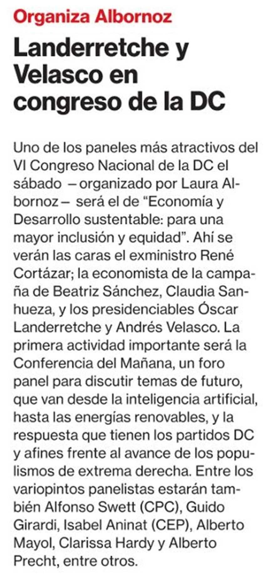 Landerretche y Velasco en congreso de la DC 09/10/2019 La Segunda Organiza Albornoz Landerretche y Velasco en congreso de la DC Uno de los paneles más atractivos del VI Congreso Nacional de la DC el sábado — organizado por Laura Albornoz-— será e... |