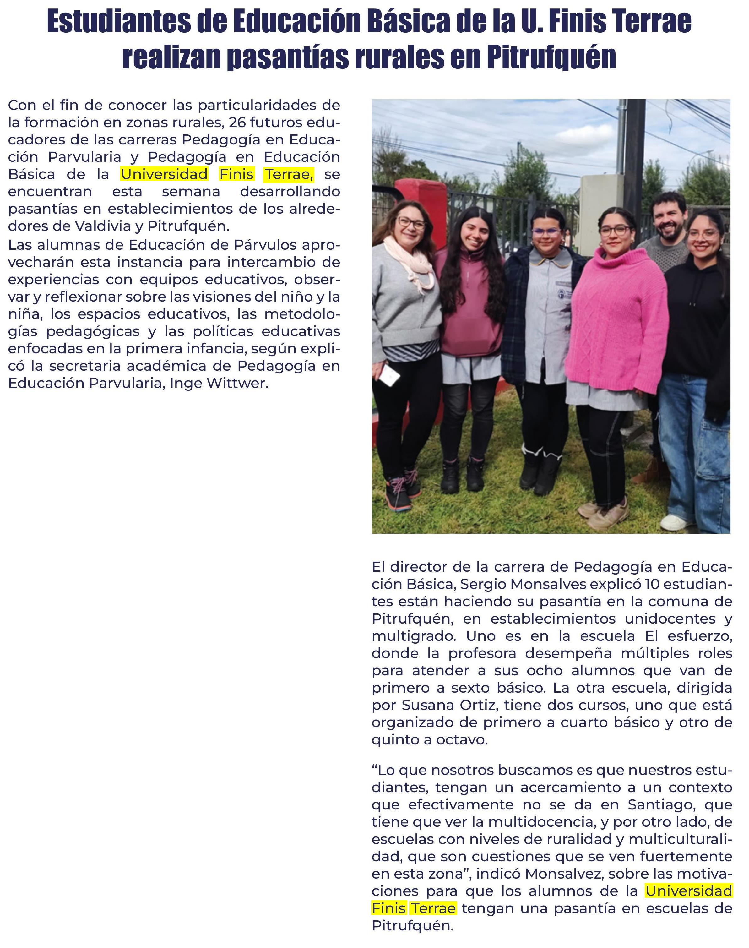 Estudiantes de Educación Básica de la U. Finis Terrae realizan pasantías rurales en Pitrufquén