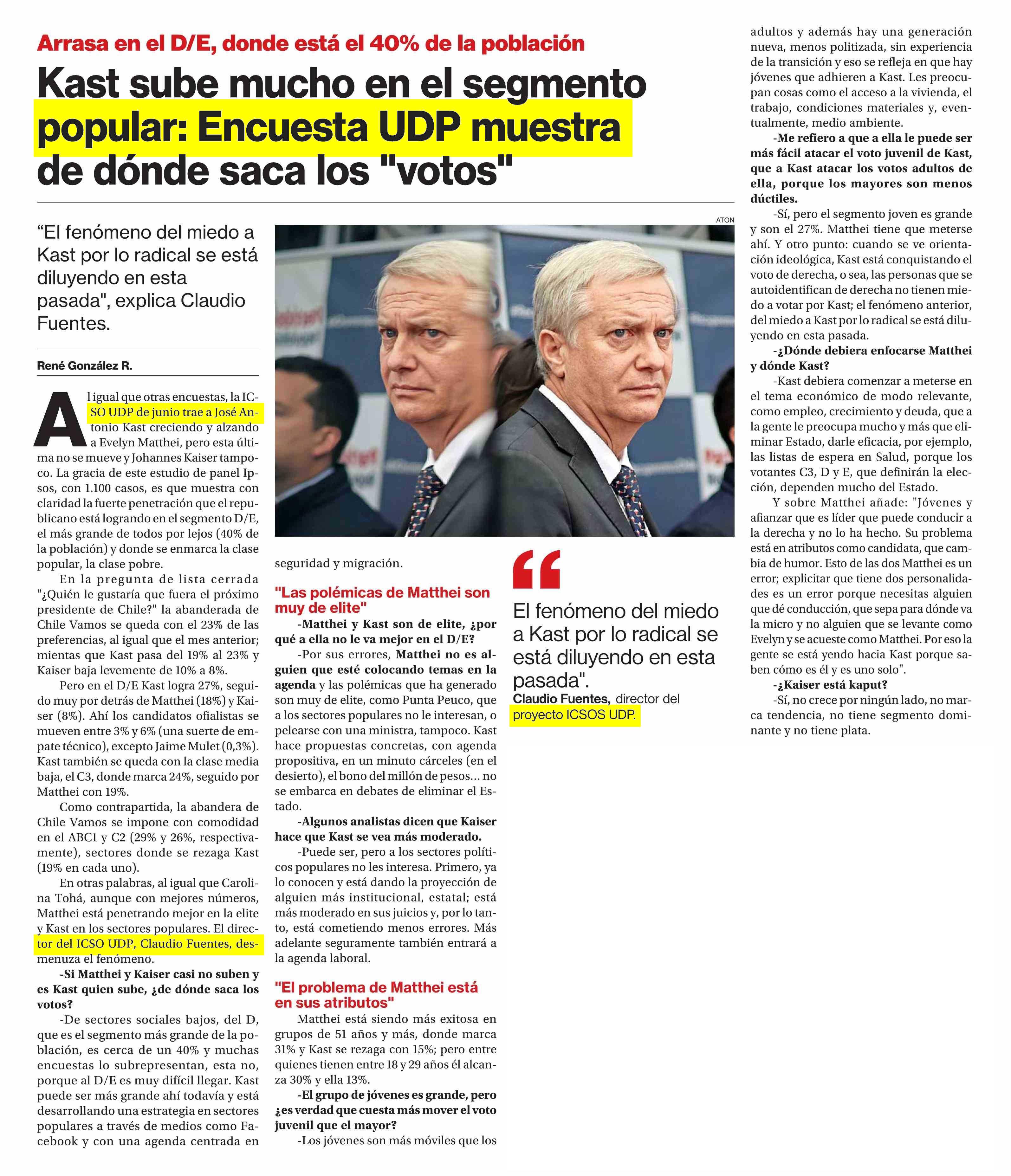 Kast sube mucho en el segmento popular: Encuesta UDP muestra de dónde saca los "votos"