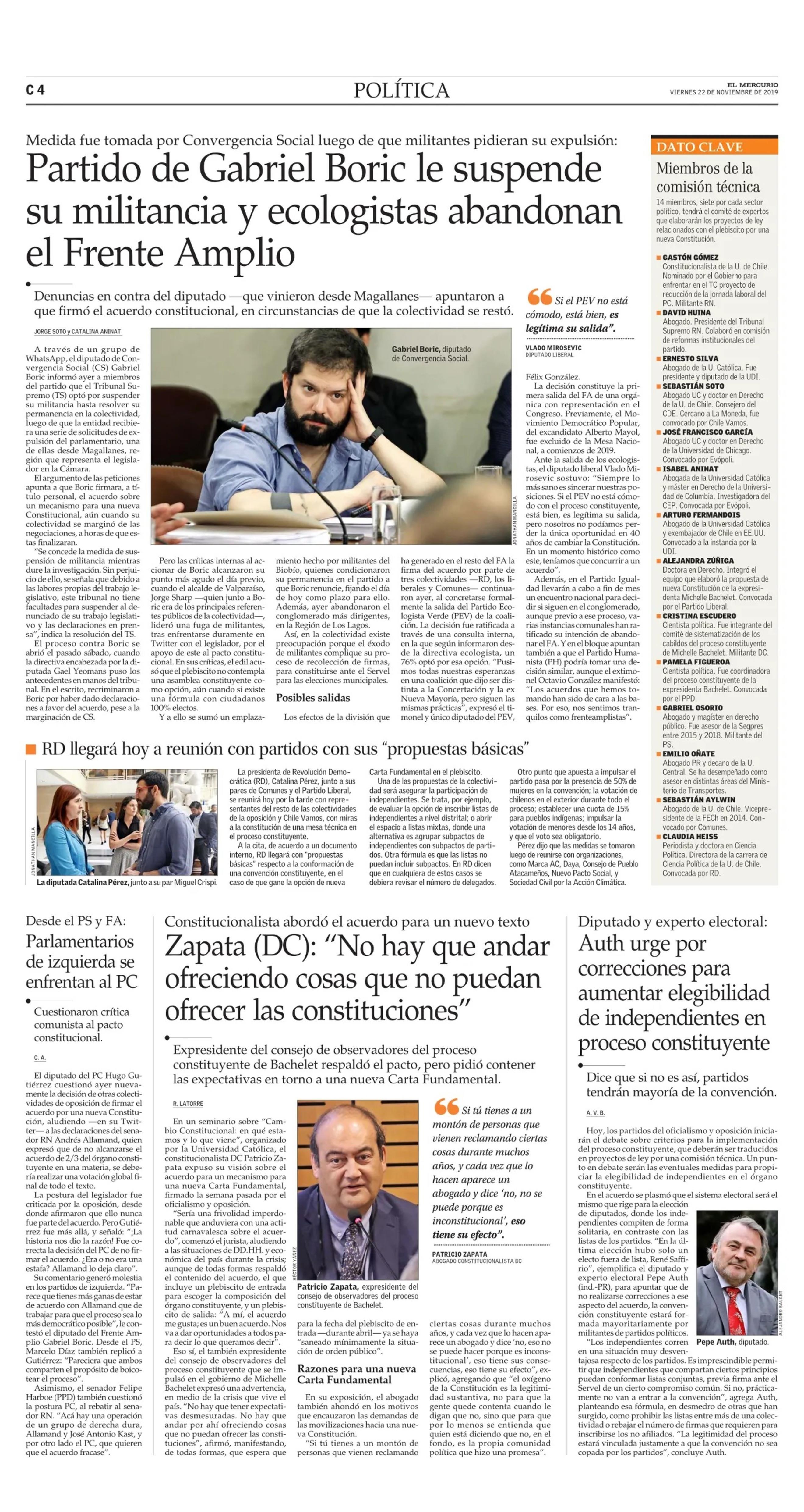 Partido de Gabriel Boric le suspende su militancia y ecologistas abandonan el Frente Amplio 22/11/2019 El Mercurio Medida fue tomada por Convergencia Social luego de que militantes pidieran su expulsión: Partido de Gabriel Boric le suspende su militancia y ecologistas abandonan el Frente Amplio ... |