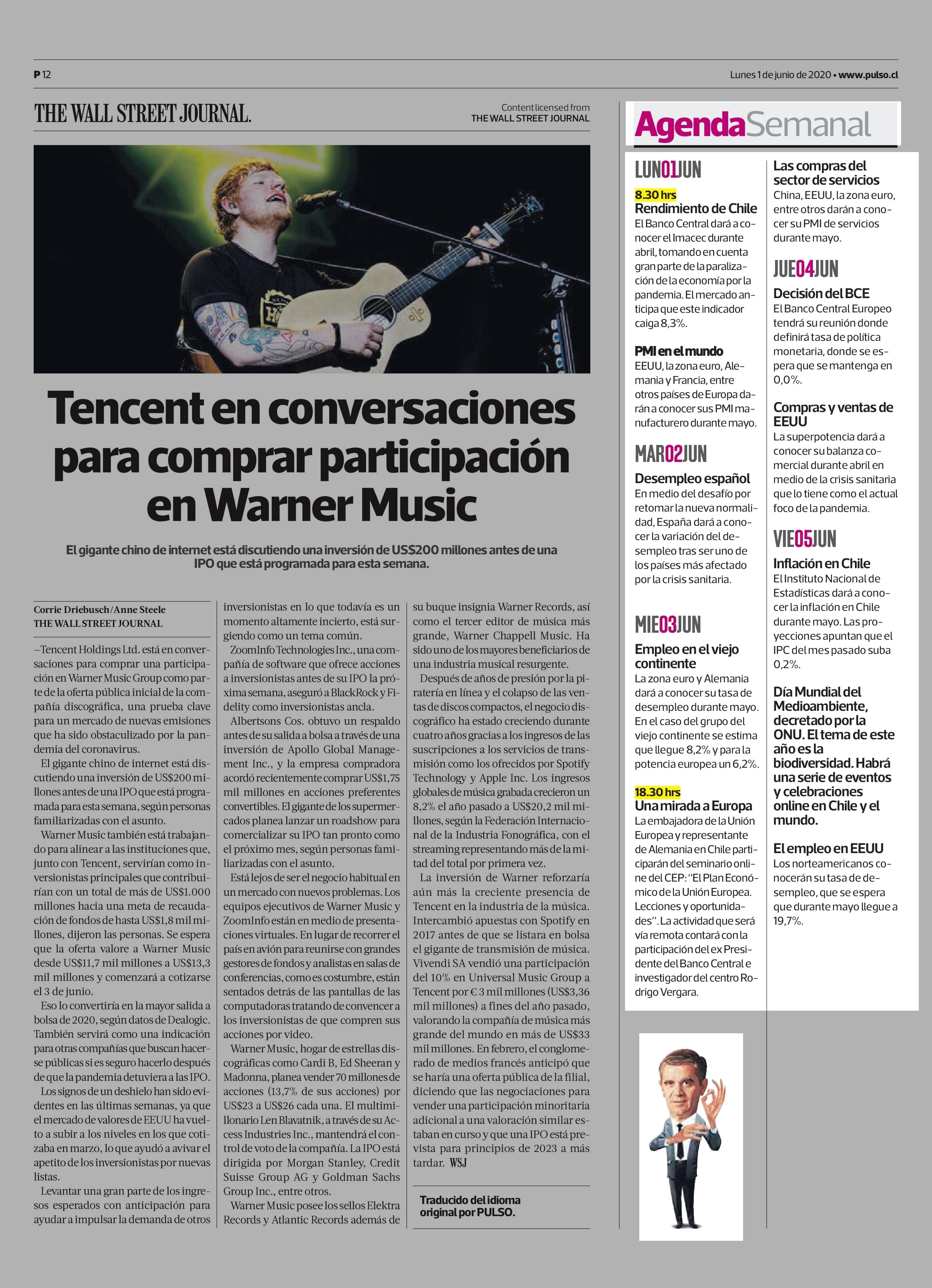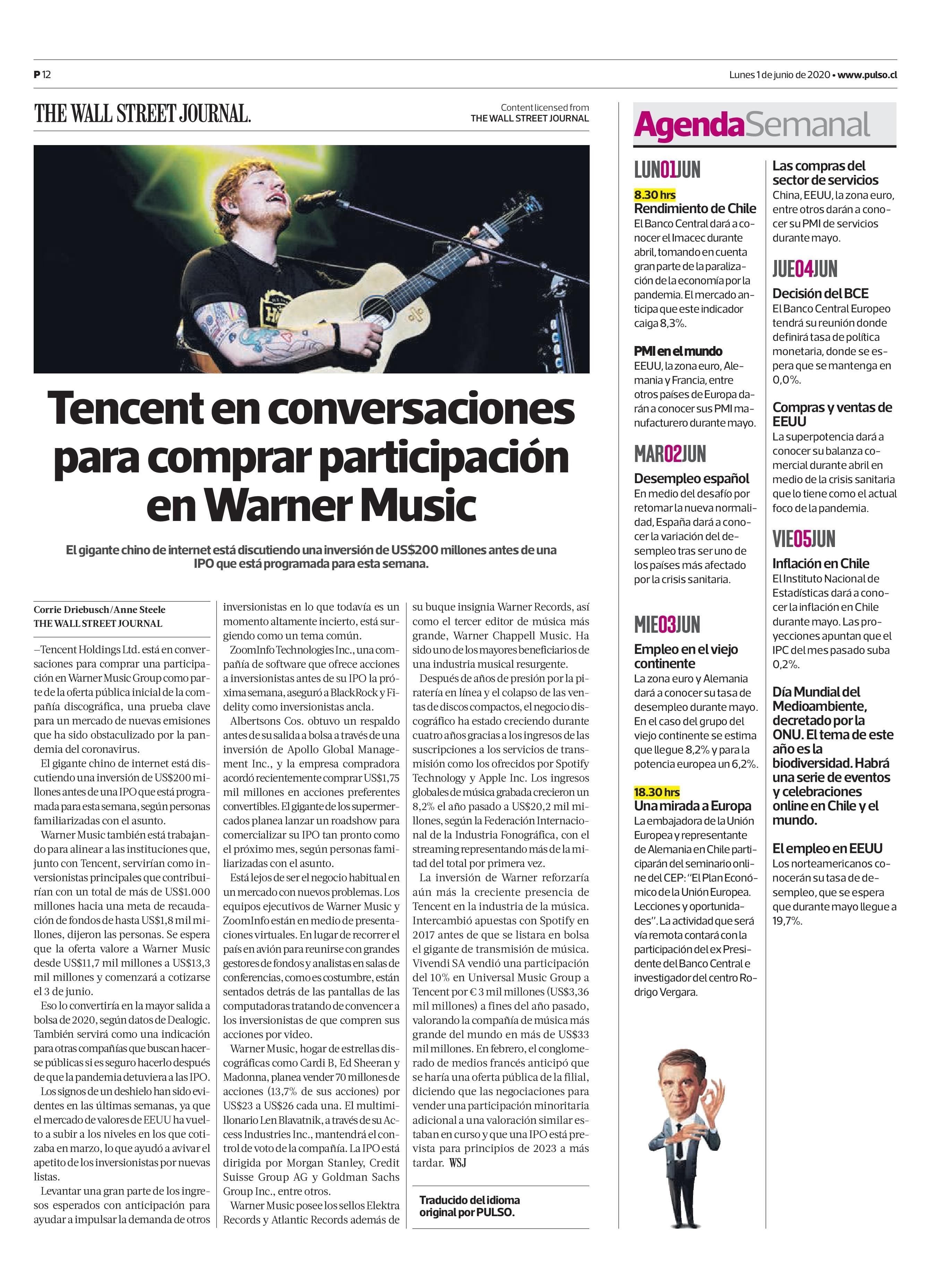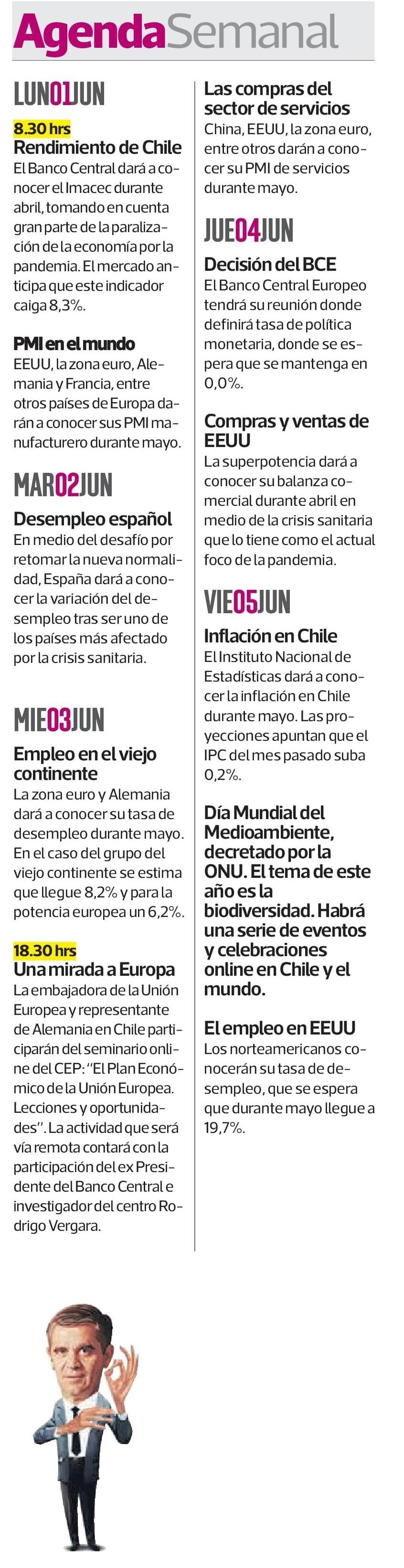 Agenda Semanal 01/06/2020 La Tercera Agenda Semanal LUNOLJUN Rendimiento de Chile El Banco Central dará aconocer el lmacec durante abril, tomando en cuenta gran parte de la paralización de la economía por la pan... |
