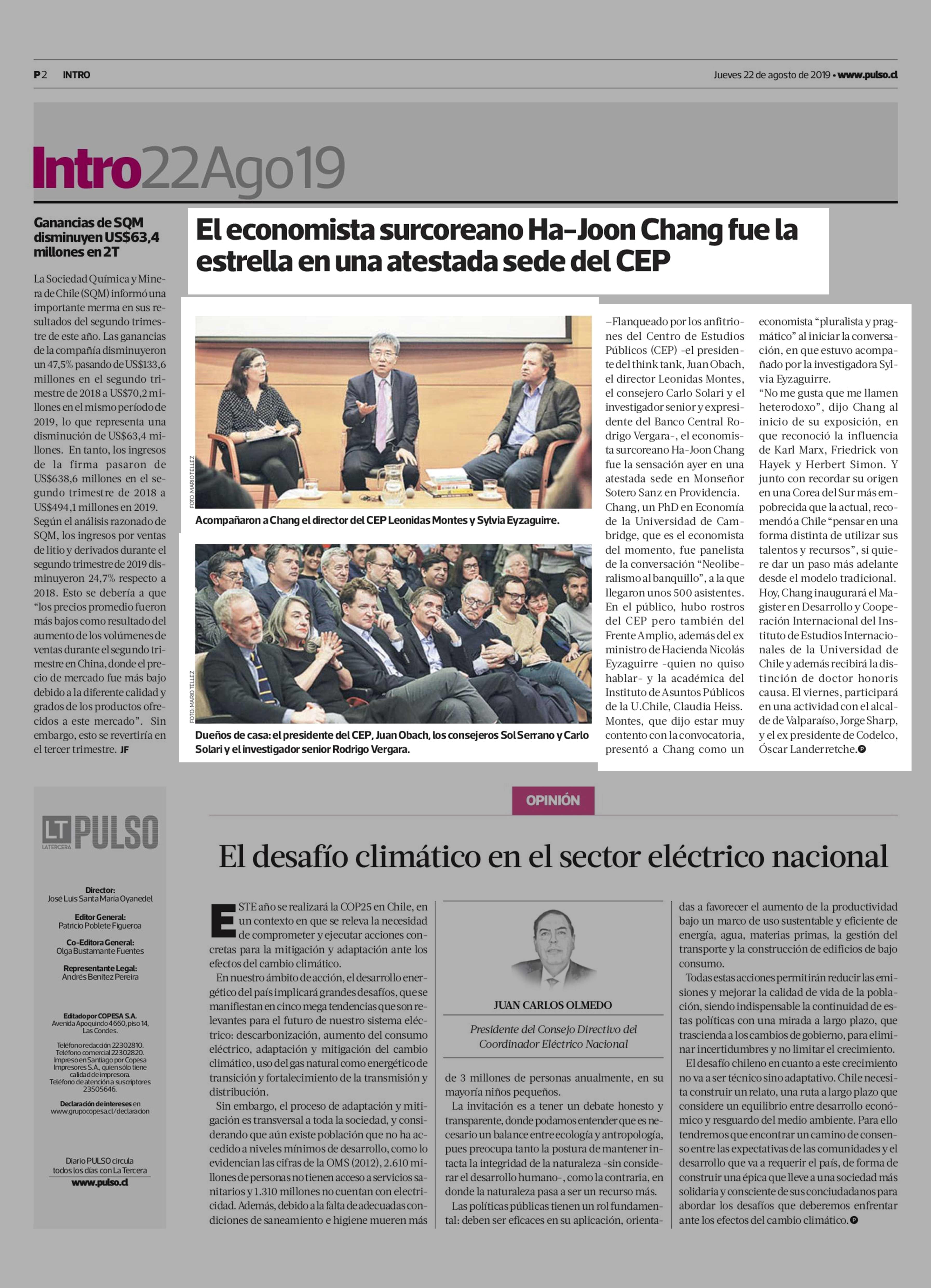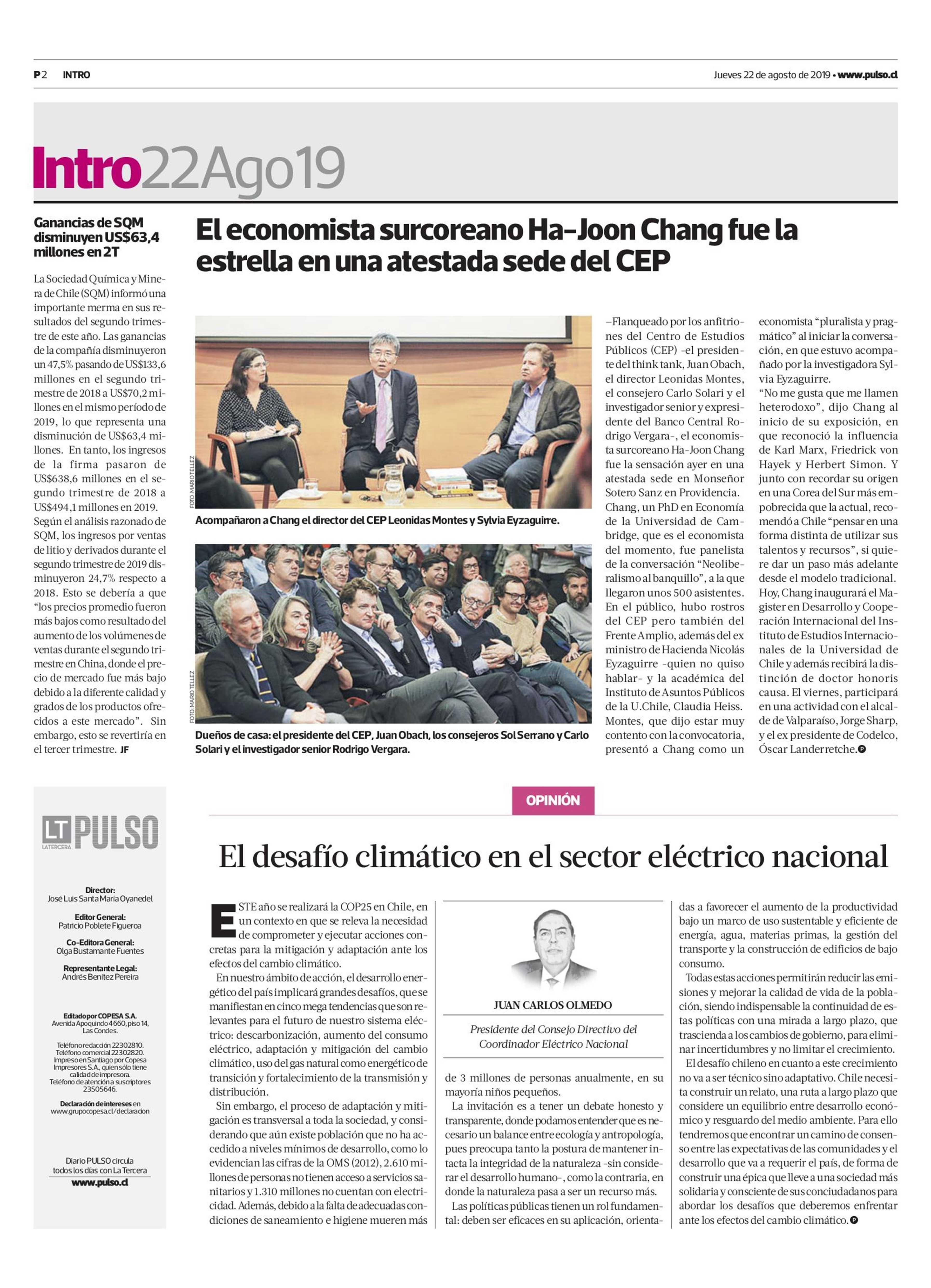 El economista surcoreano Ha-Joon Chang fue la estrella en una atestada sede del CEP 22/08/2019 La Tercera El economista surcoreano Ha-Joon Chang fue la estrella en una atestada sede del CEP —Flanqueado por los anfitriones del Centro de Estudios Públicos (CEP) -el presidentedelthink tank, ... |