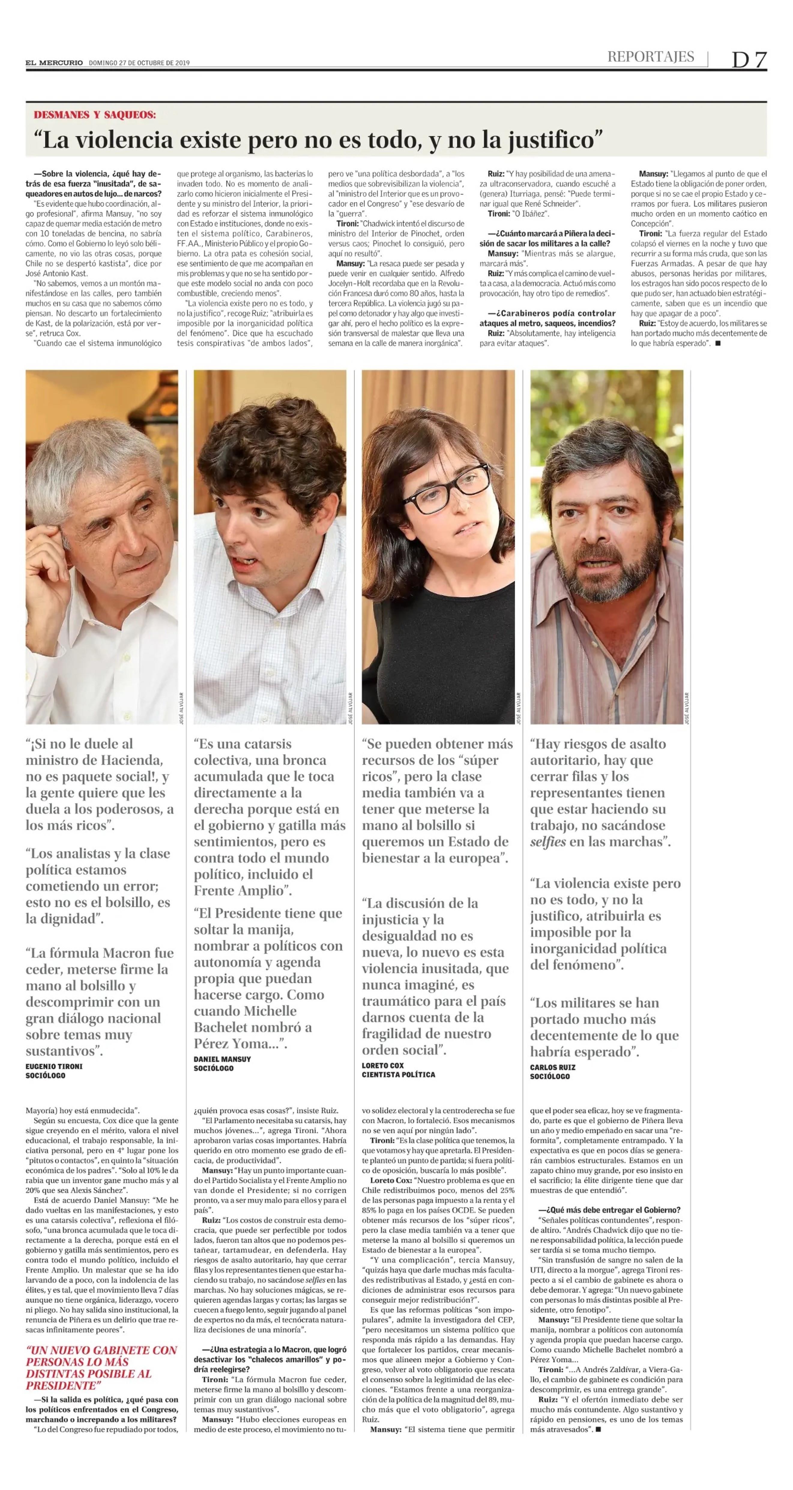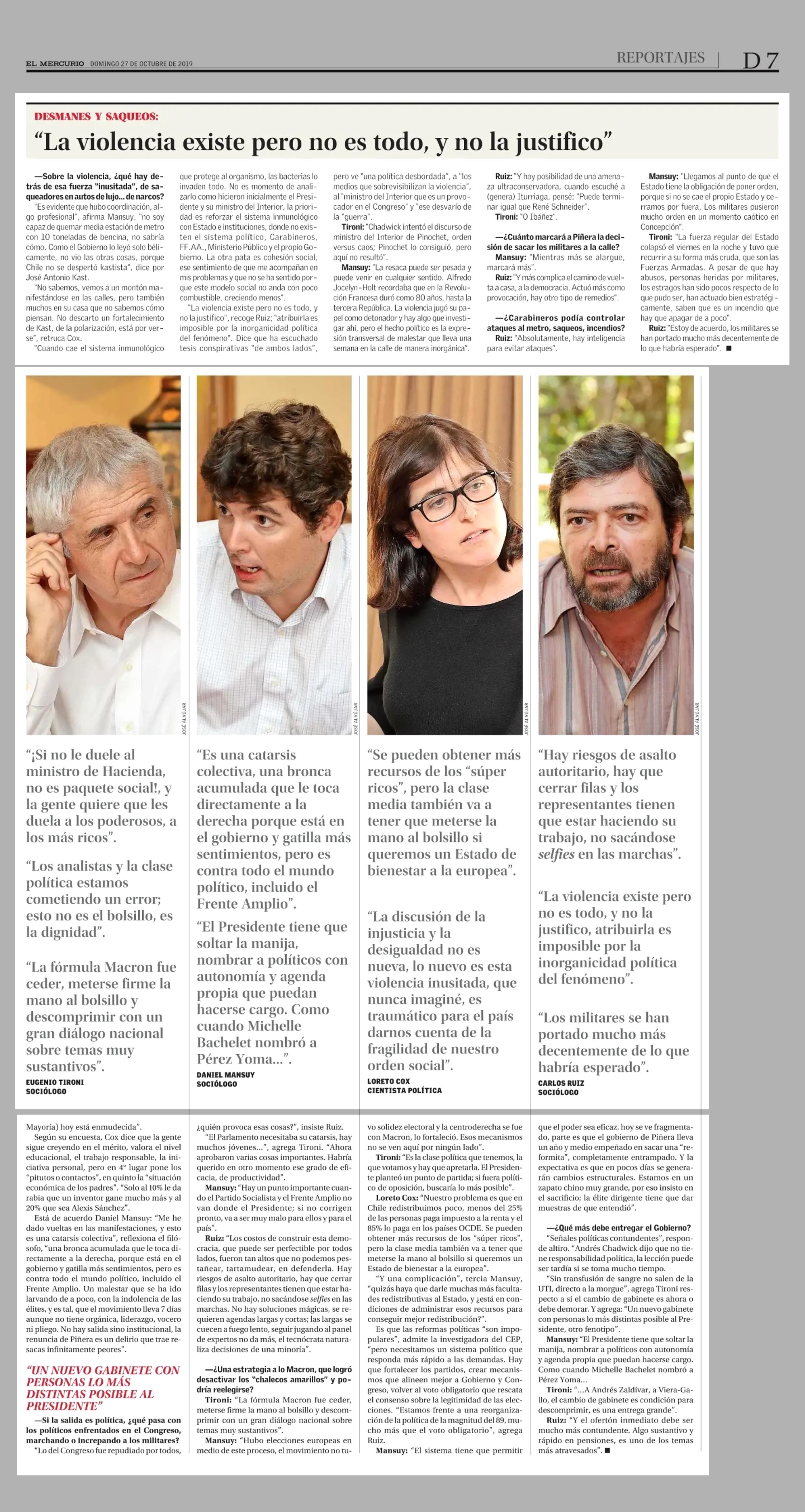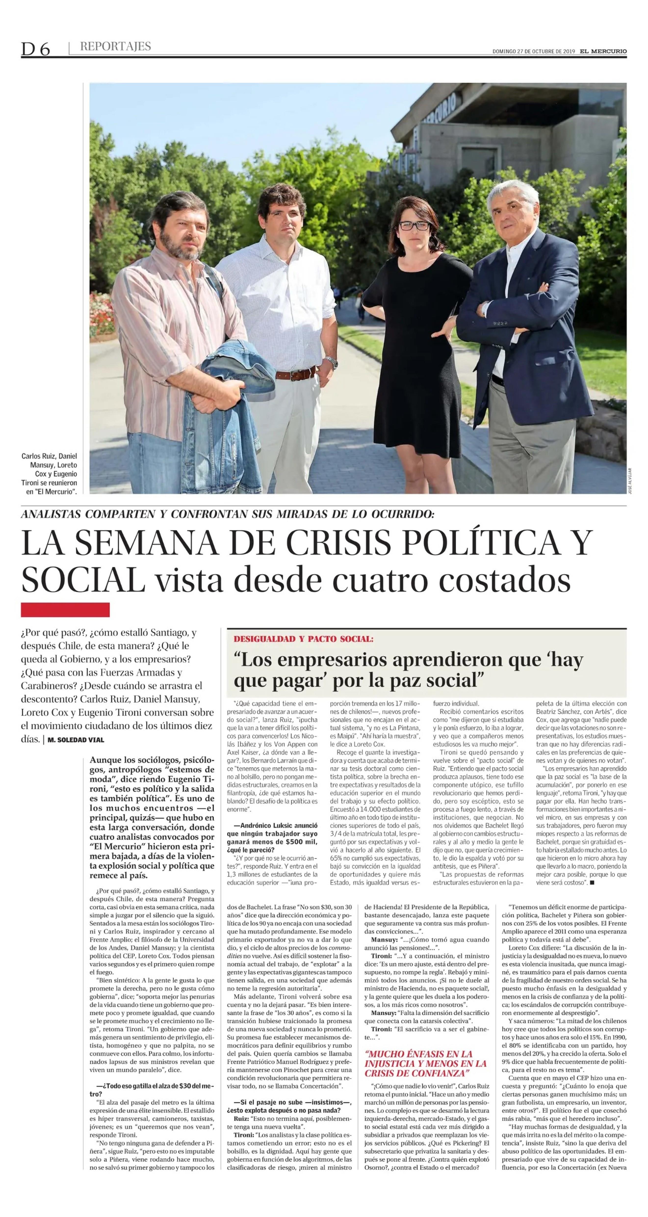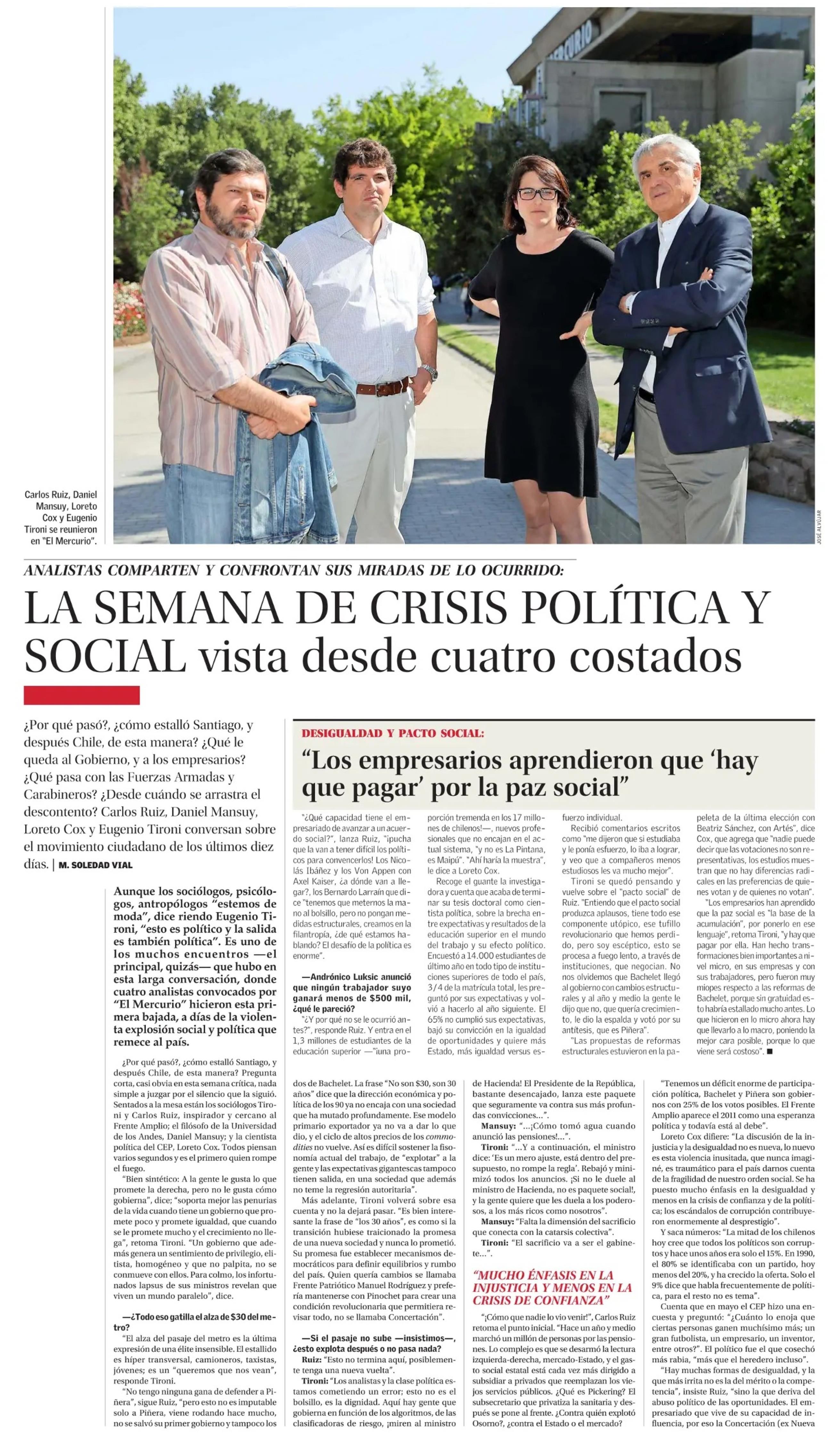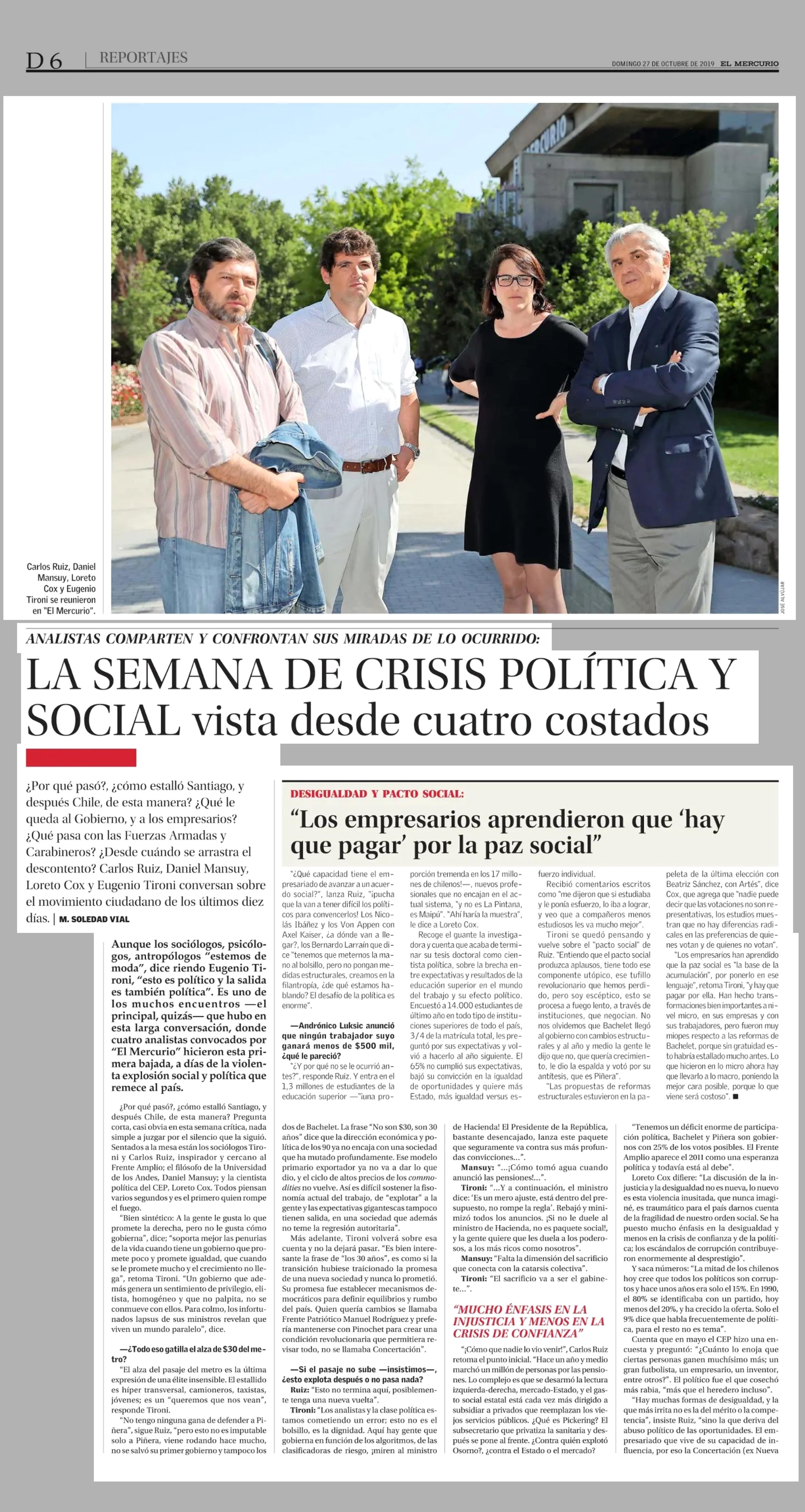 LA SEMANA DE CRISIS POLÍTICA Y SOCIAL vista desde cuatro costados 27/10/2019 El Mercurio ANALISTAS COMPARTEN Y CONFRONTAN SUS MIRADAS DE LO OCURRIDO: LA SEMANA DE CRISIS POLÍTICA Y SOCIAL vista desde cuatro costados ¿ Por qué pasó?, ¿cómo estalló Santiago, y después Ch... |