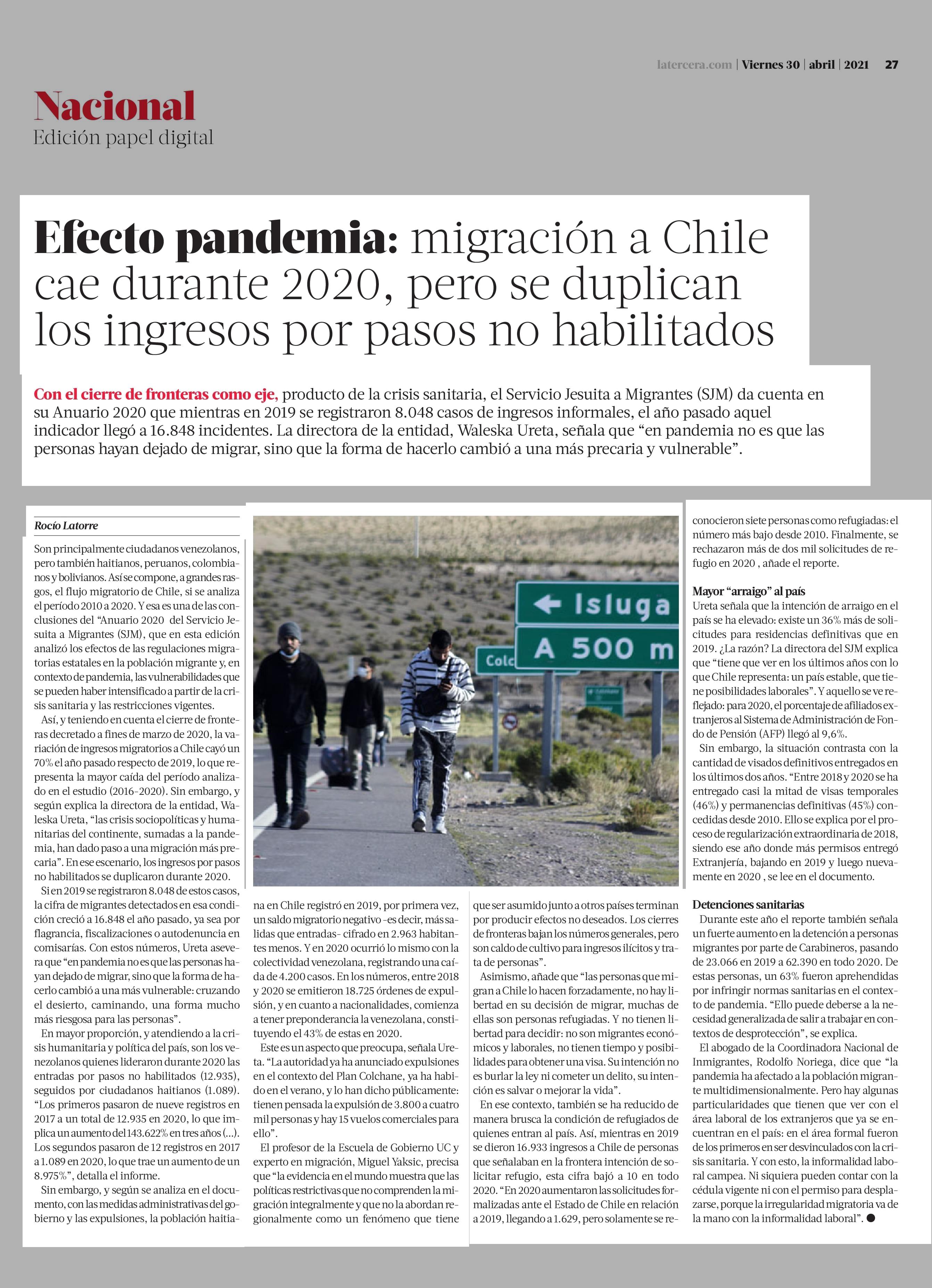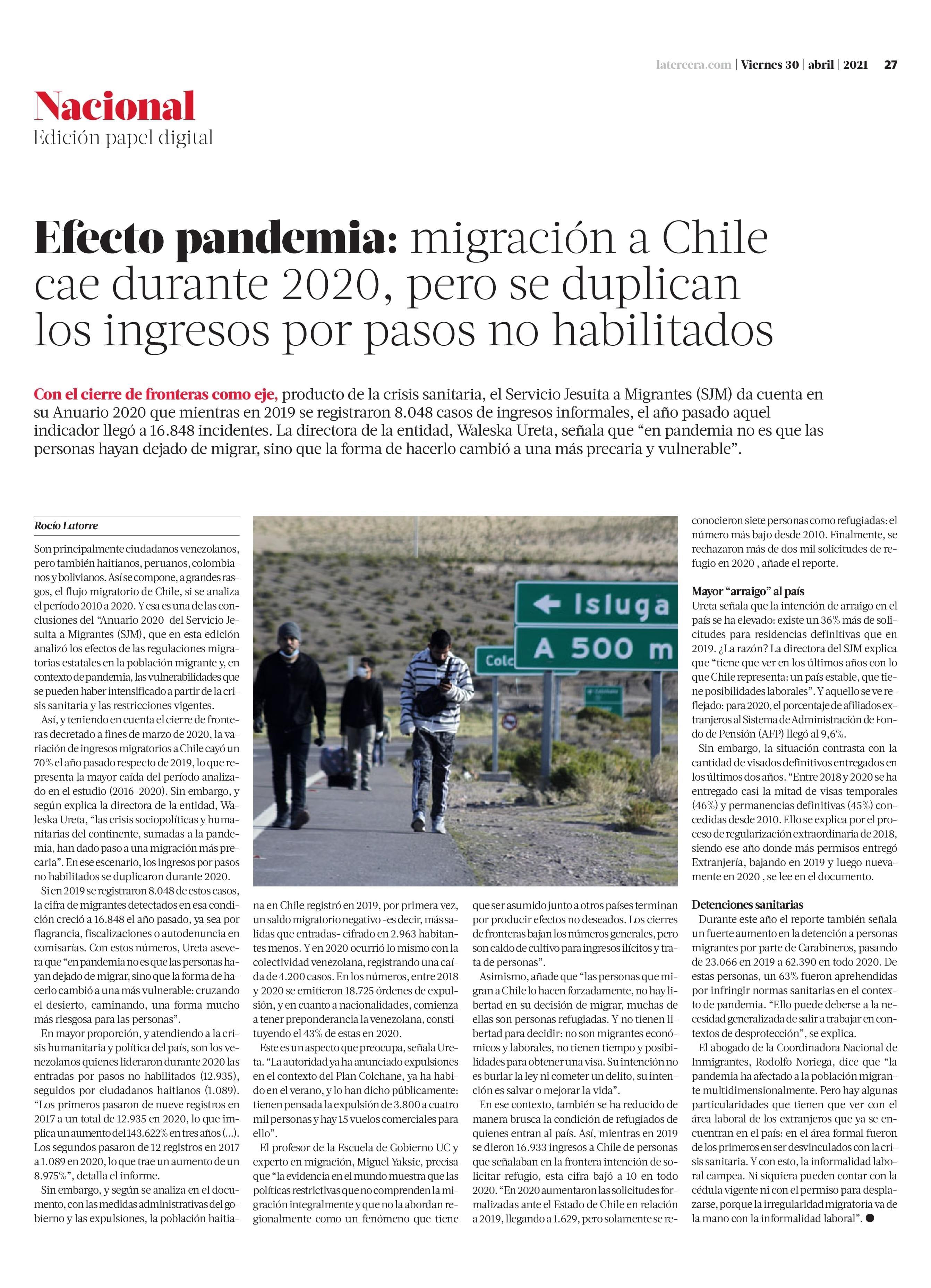 Efecto pandemia: migración a Chile cae durante 2020, pero se duplican los ingresos por pasos no habilitados 30-04-2021 La Tercera |