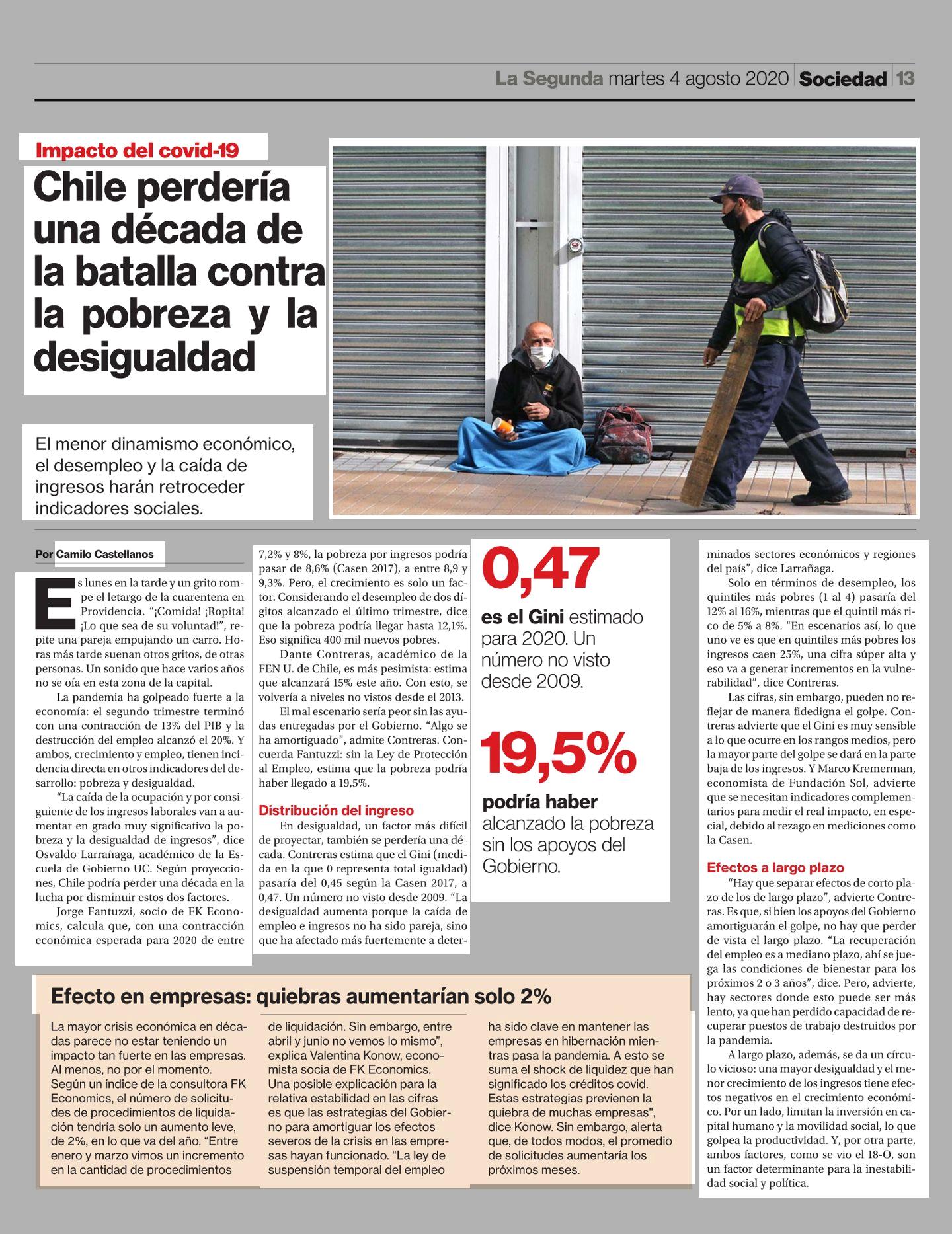 Chile perdería una década de la batalla contra la pobreza y la desigualdad 04-08-2020 La Segunda |