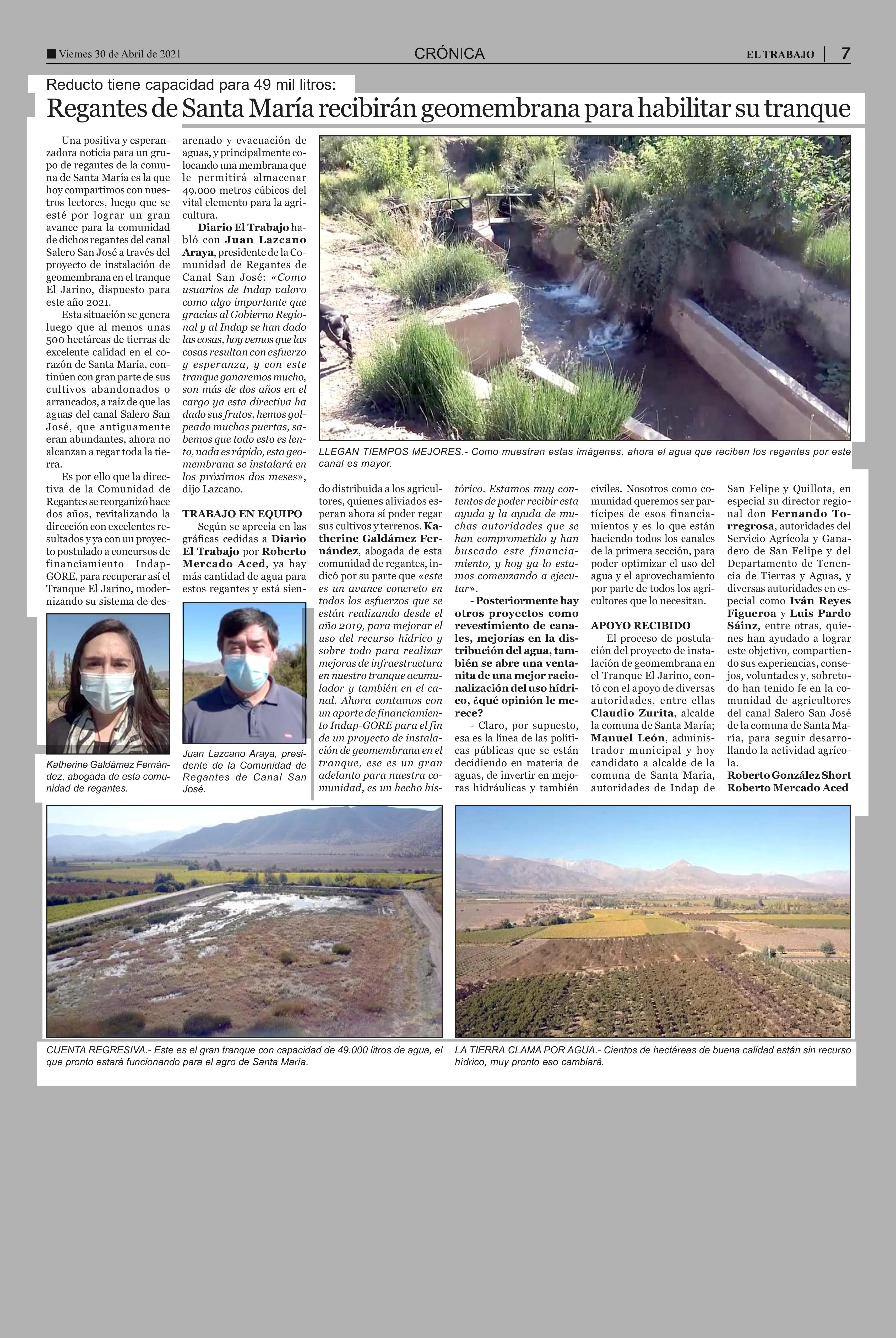 Regantes de Santa María recibirán geomembrana para habilitar su tranque 30-04-2021 El Trabajo |