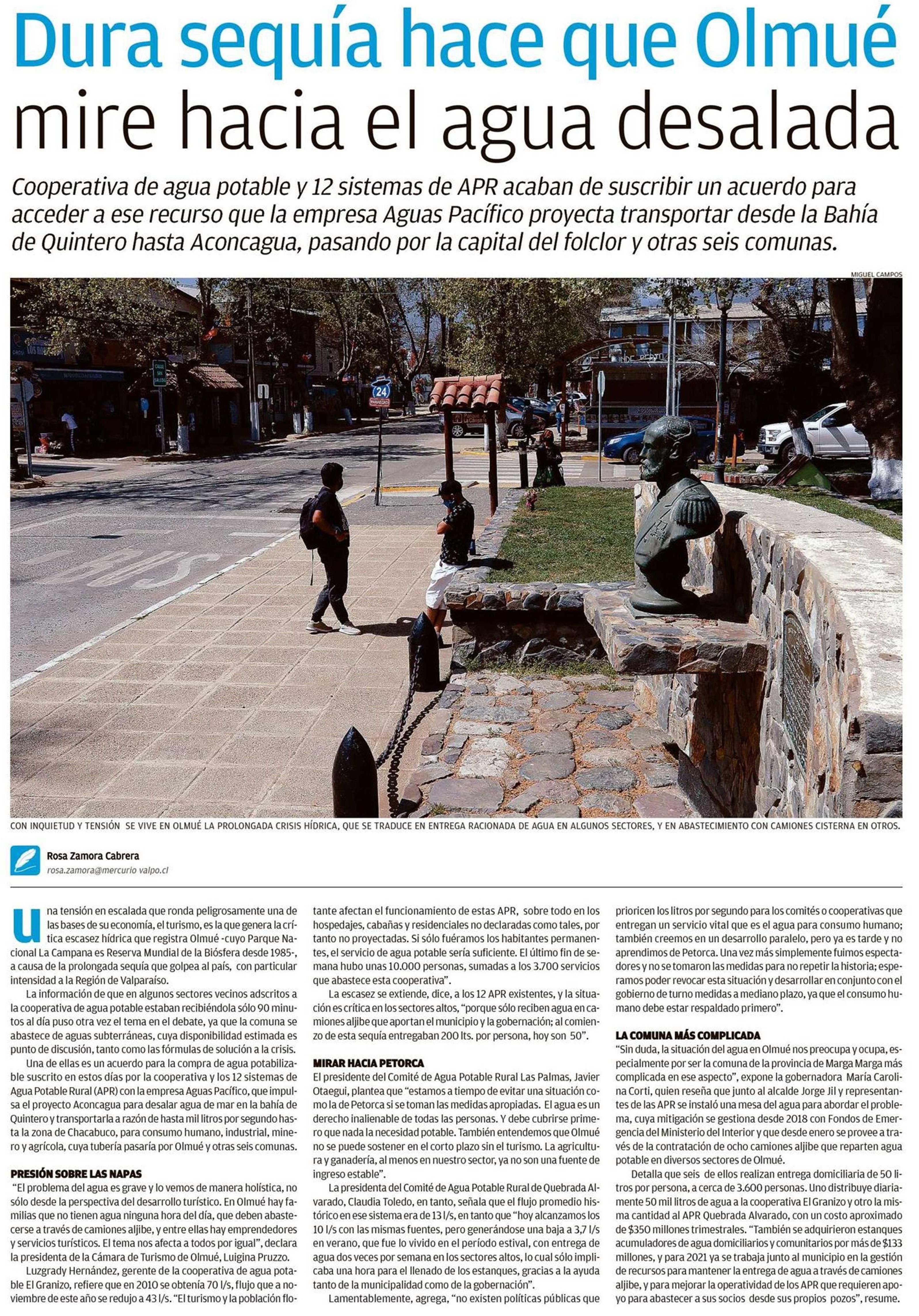 Dura sequía hace que Olmué mire hacia el agua desalada 13-12-2020 El Mercurio de Valparaíso |