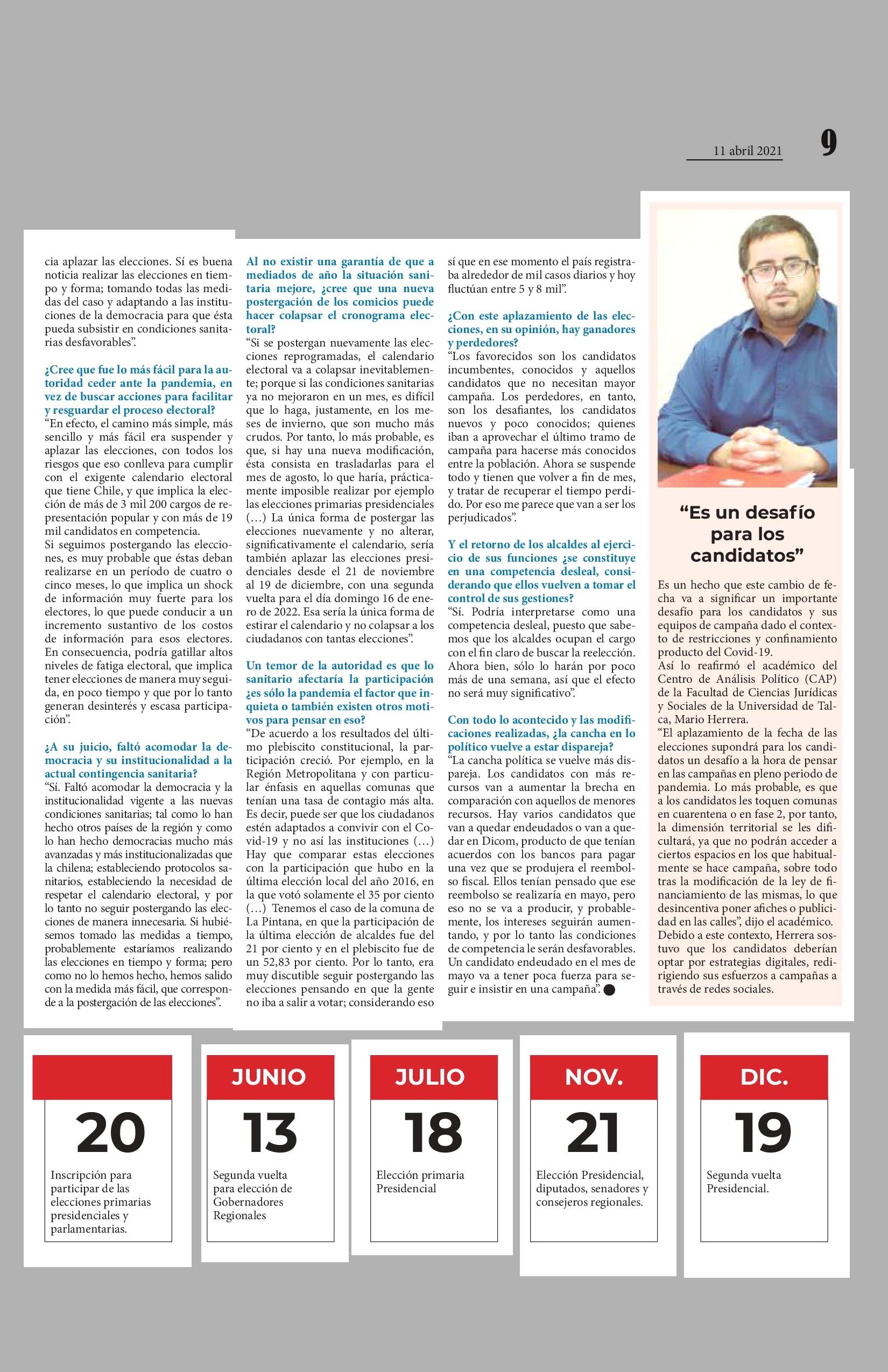 “Nunca es una buena noticia aplazar las elecciones” 17-04-2021 Diario Talca |