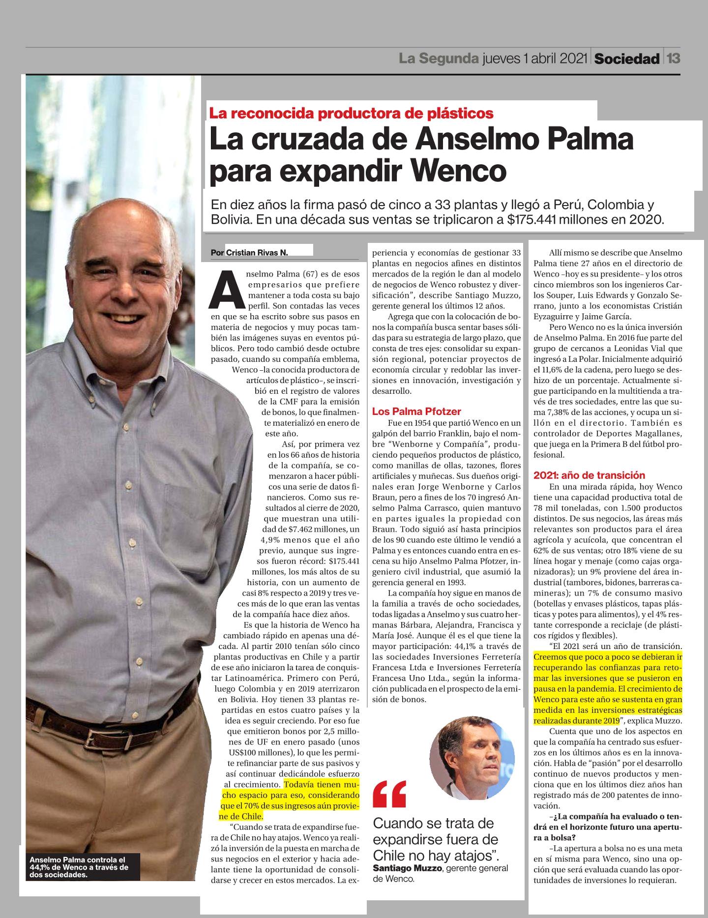 La cruzada de Anselmo Palma para expandir Wenco 01-04-2021 La Segunda |