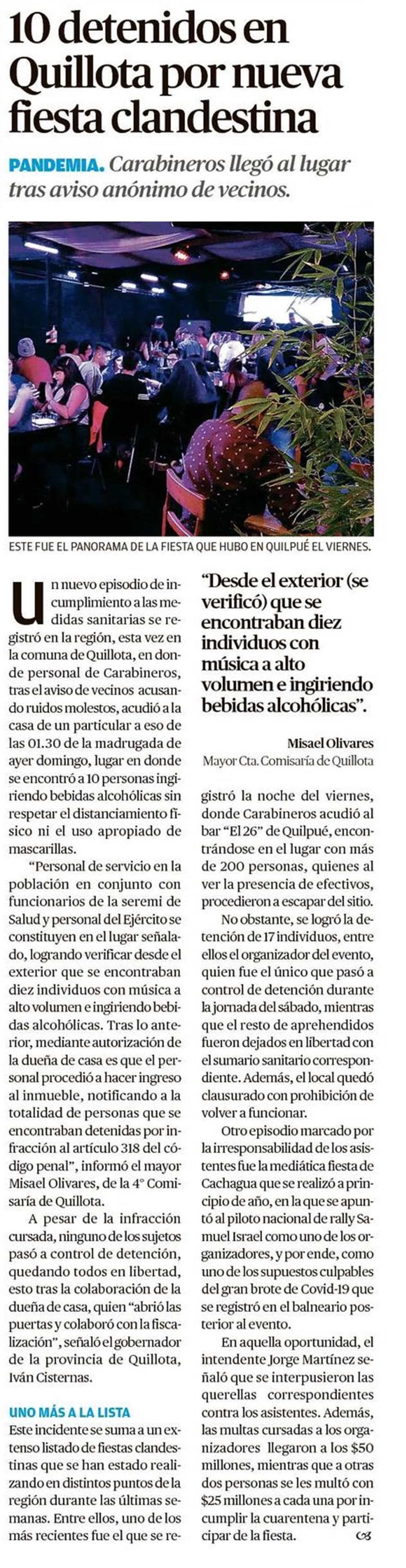 10 detenidos en Quillota por nueva fiesta clandestina 08-03-2021 El Mercurio de Valparaíso |