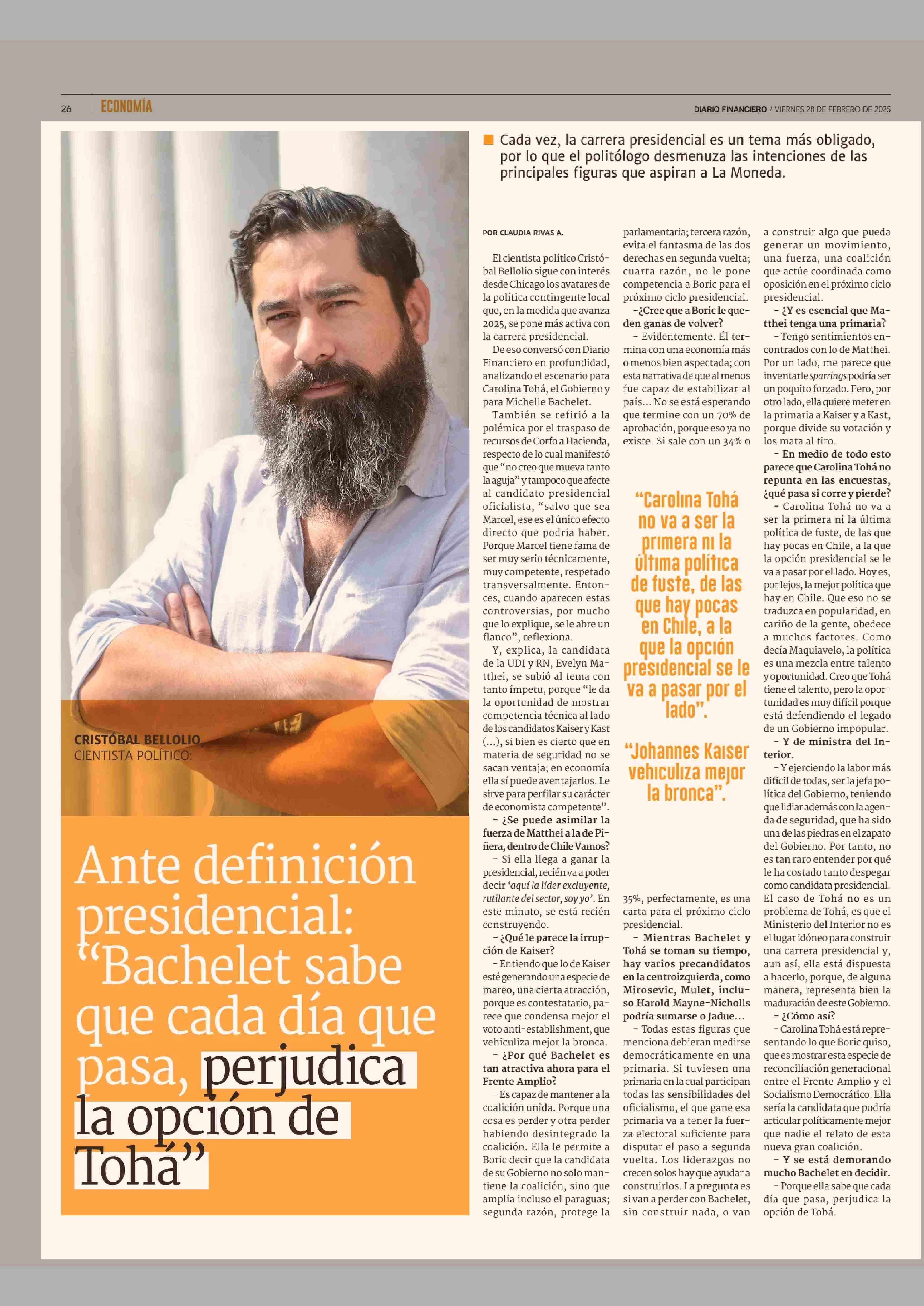 Ante definición presidencial: Bachelet sabe que cada día que pasa, perjudica la opción de Tohá" 28-02-2025 Diario Financiero |