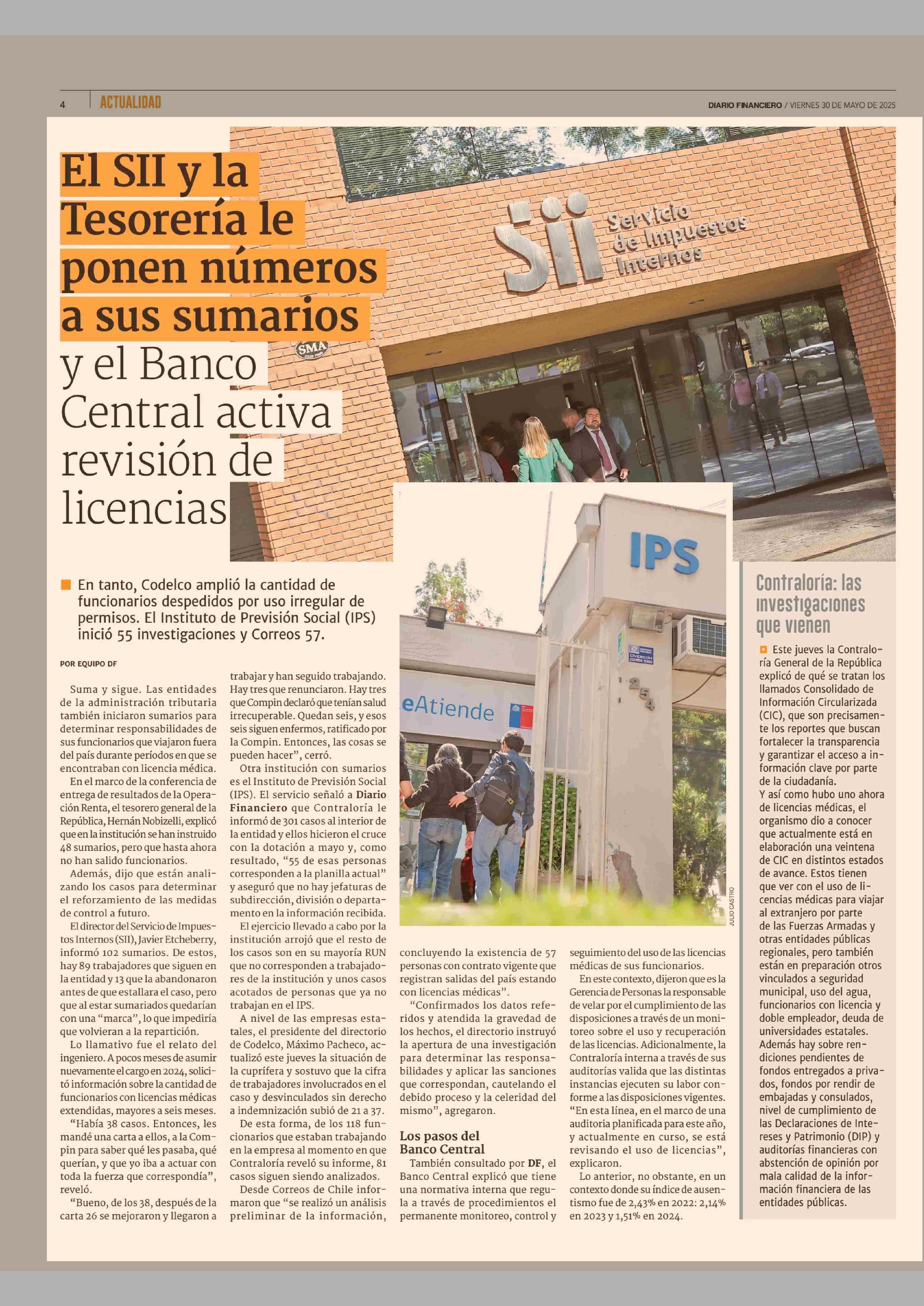 El SII y la Tesorería le ponen números a sus sumarios y el Banco Central activa revisión de licencias 30-05-2025 Diario Financiero |