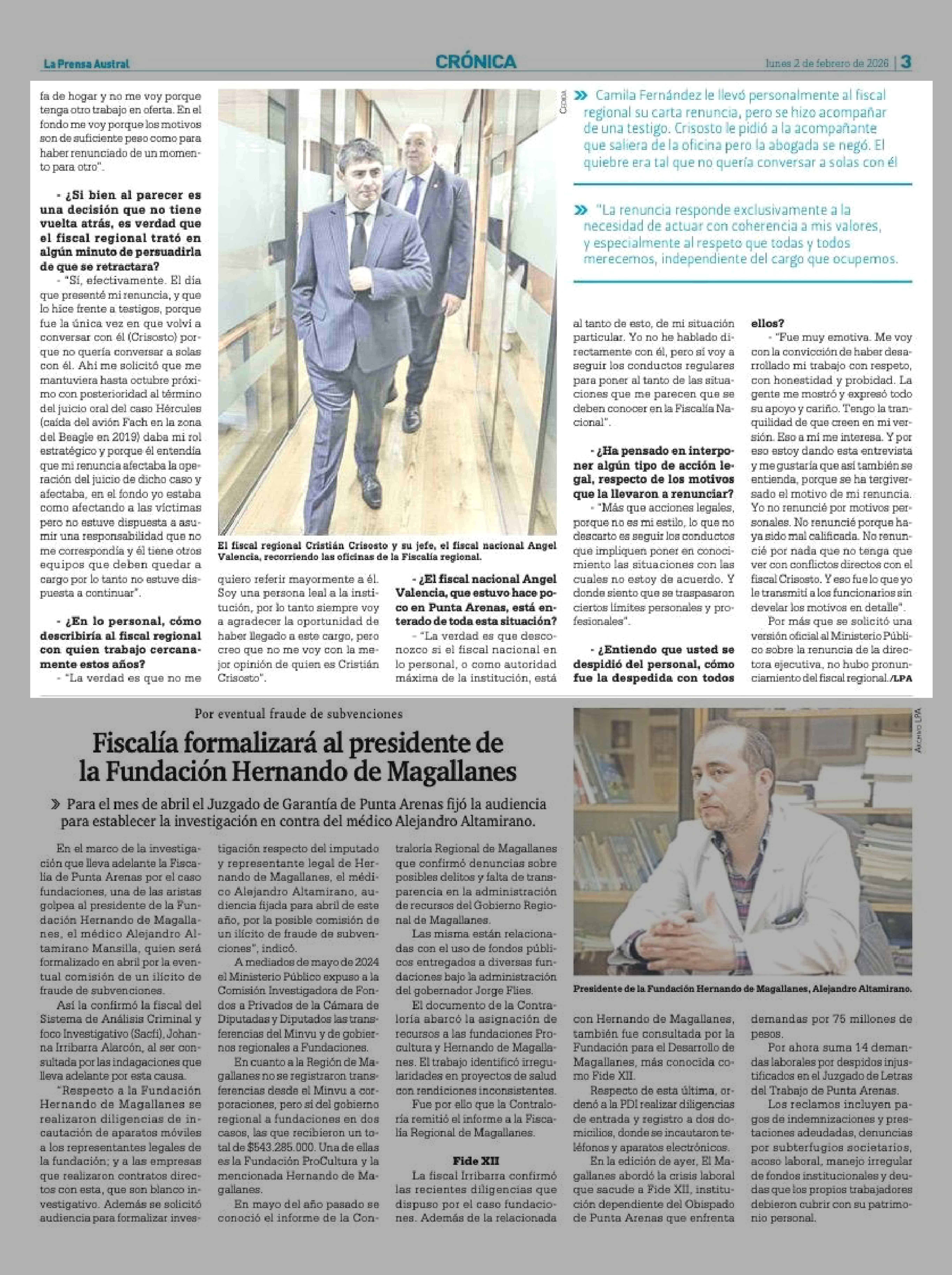 Exdirectora ejecutiva de la Fiscalía regional: "No me voy con la mejor opinión de quien es Cristián Crisosto" 02-02-2026 La Prensa Austral |
