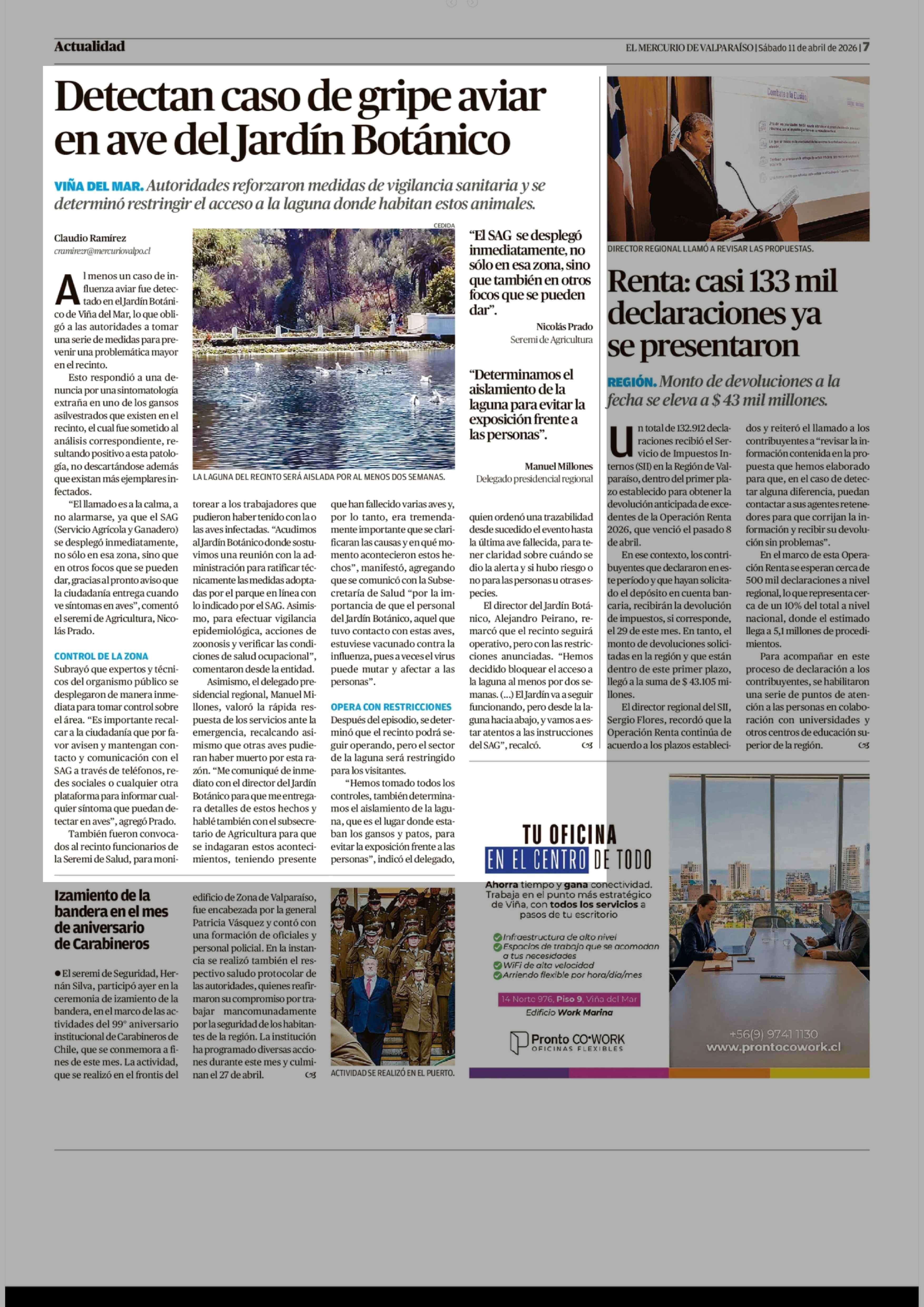Detectan caso de gripe aviar en ave del Jardín Botánico 11-04-2026 El Mercurio de Valparaíso |