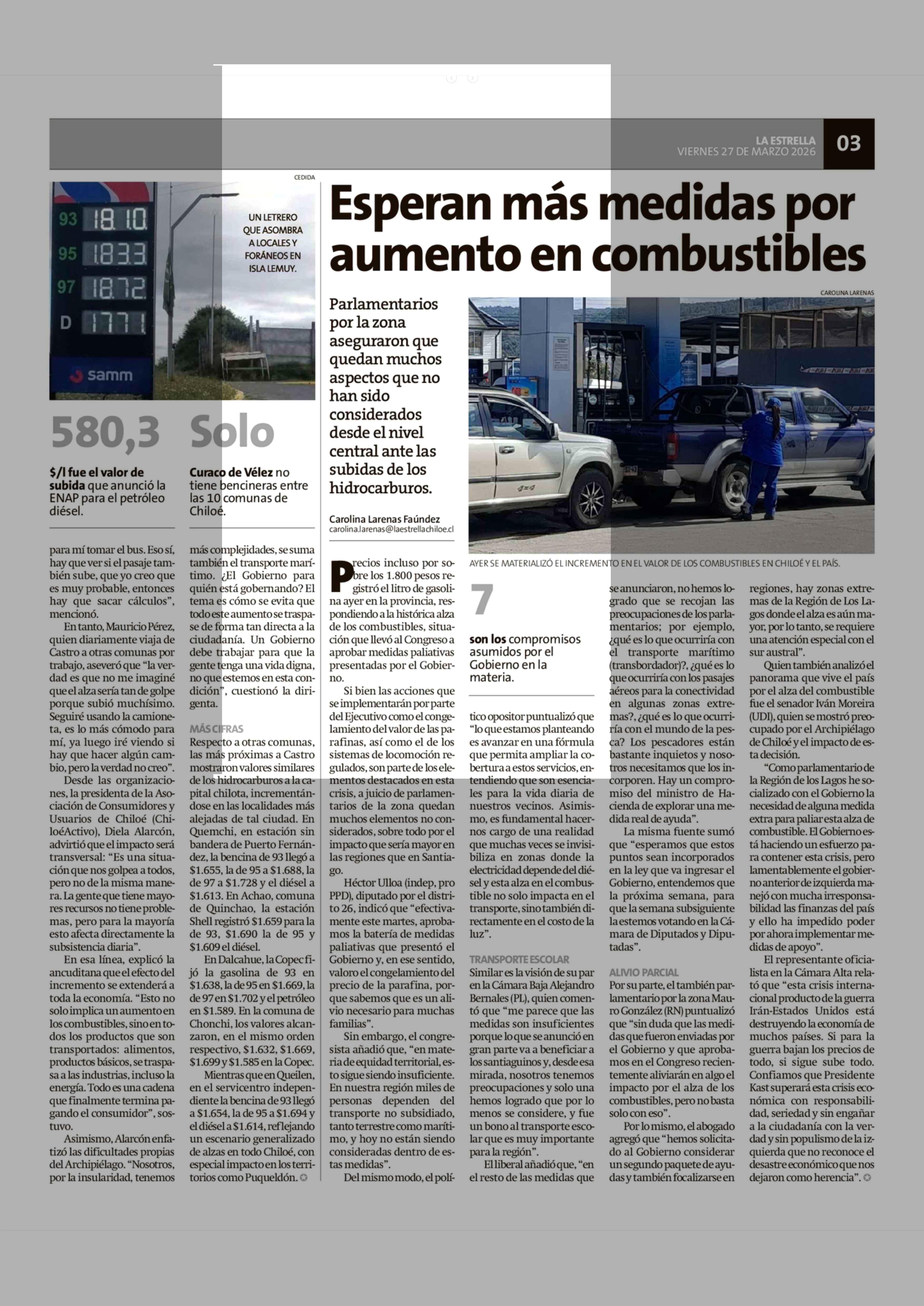 Esperan más medidas por aumento en combustibles 27-03-2026 La Estrella de Chiloé |