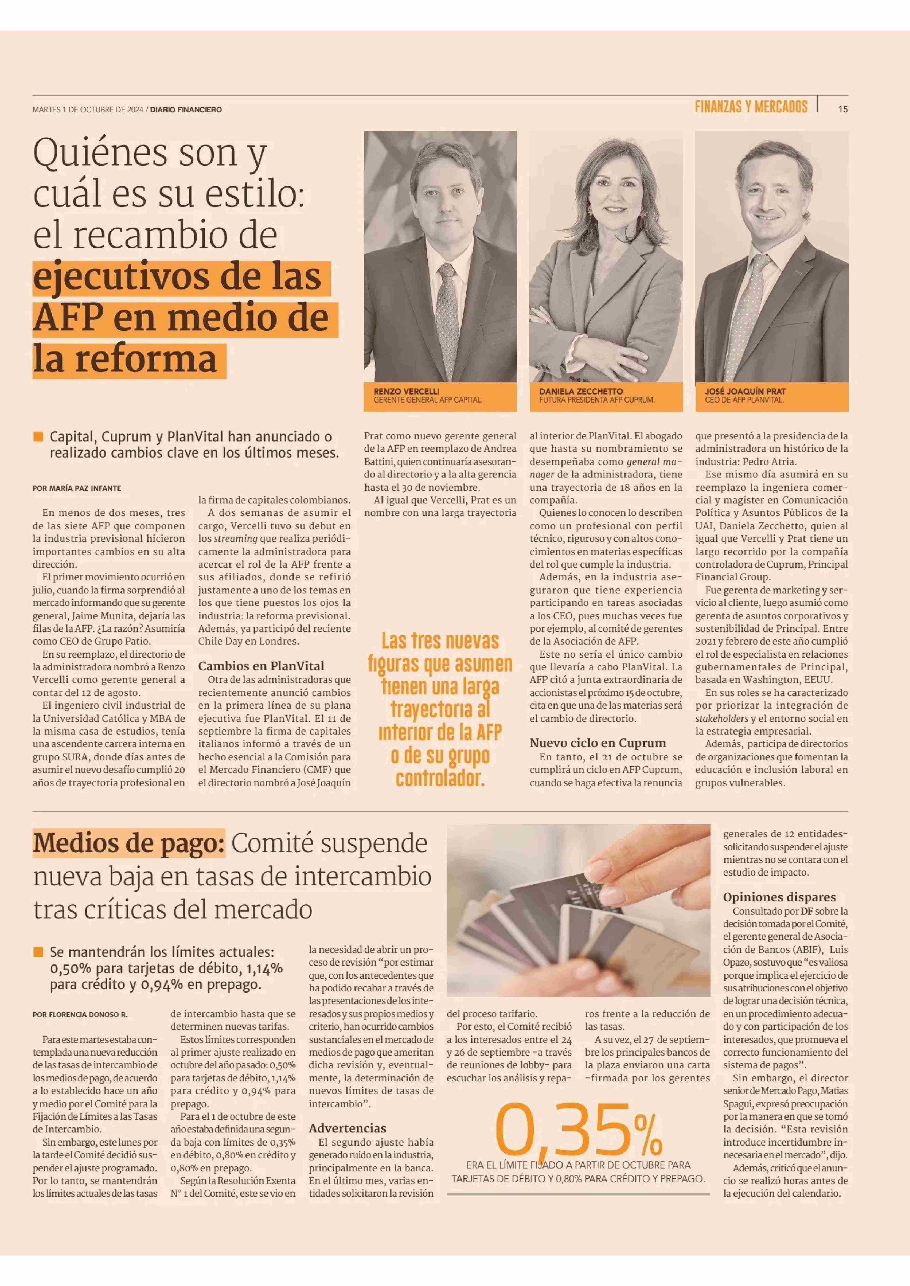 Quiénes son y cuál es su estilo: el recambio de ejecutivos de las AFP en medio de la reforma 01-10-2024 Diario Financiero |