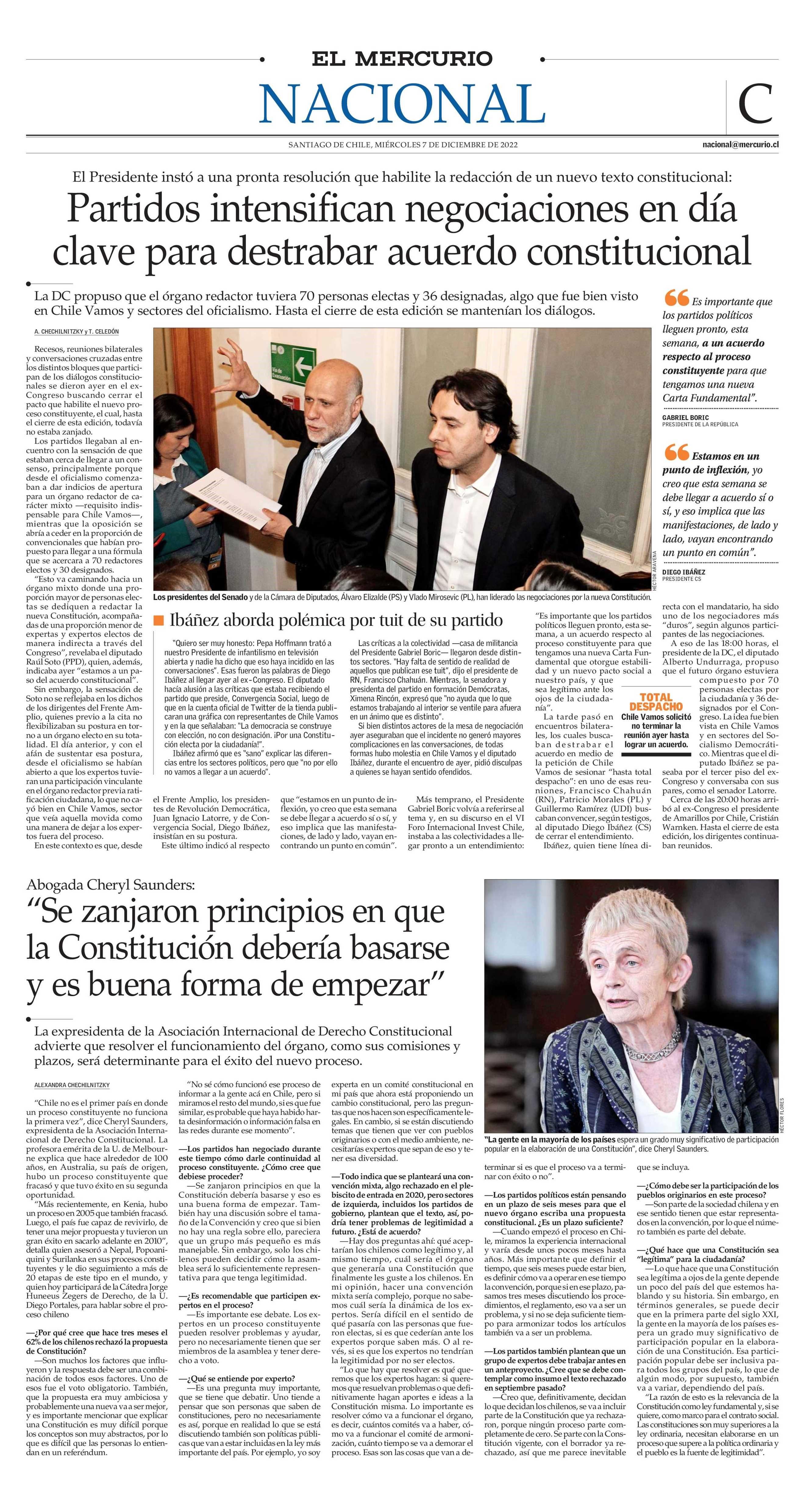 Abogada Cheryl Saunders: “Se zanjaron principios en que la Constitución debería basarse y es buena forma de empezar” 07-12-2022 El Mercurio |