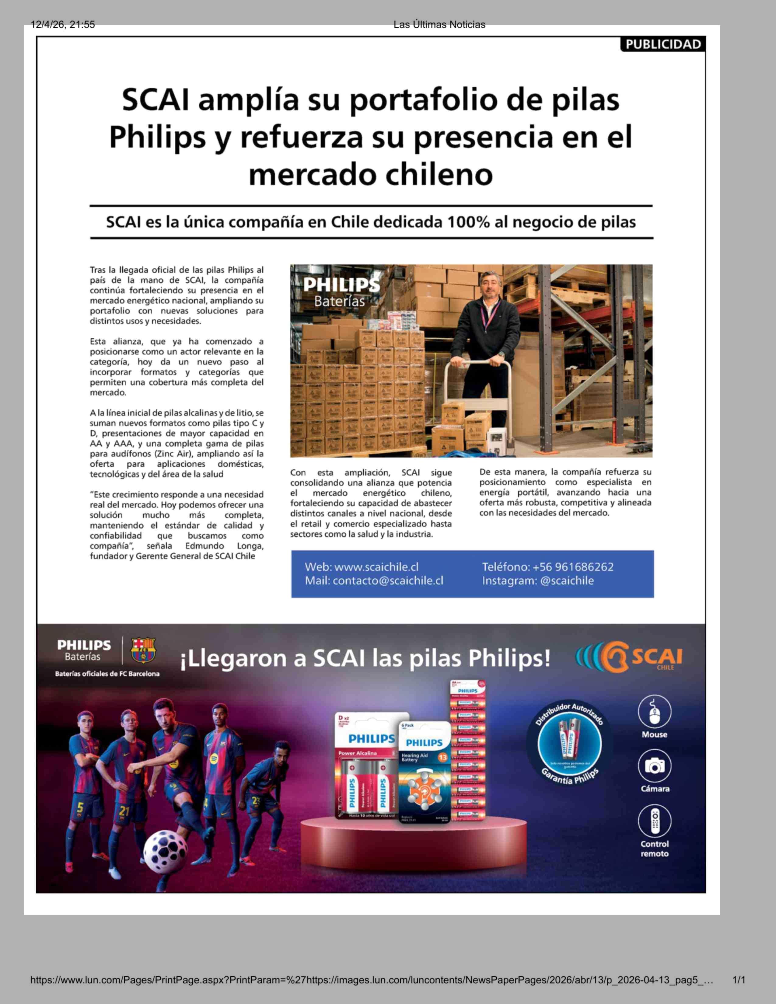 Título: Aviso Publicitario: SCAI amplía su portafolio de pilas Philips y refuerza su presencia en el mercado chileno