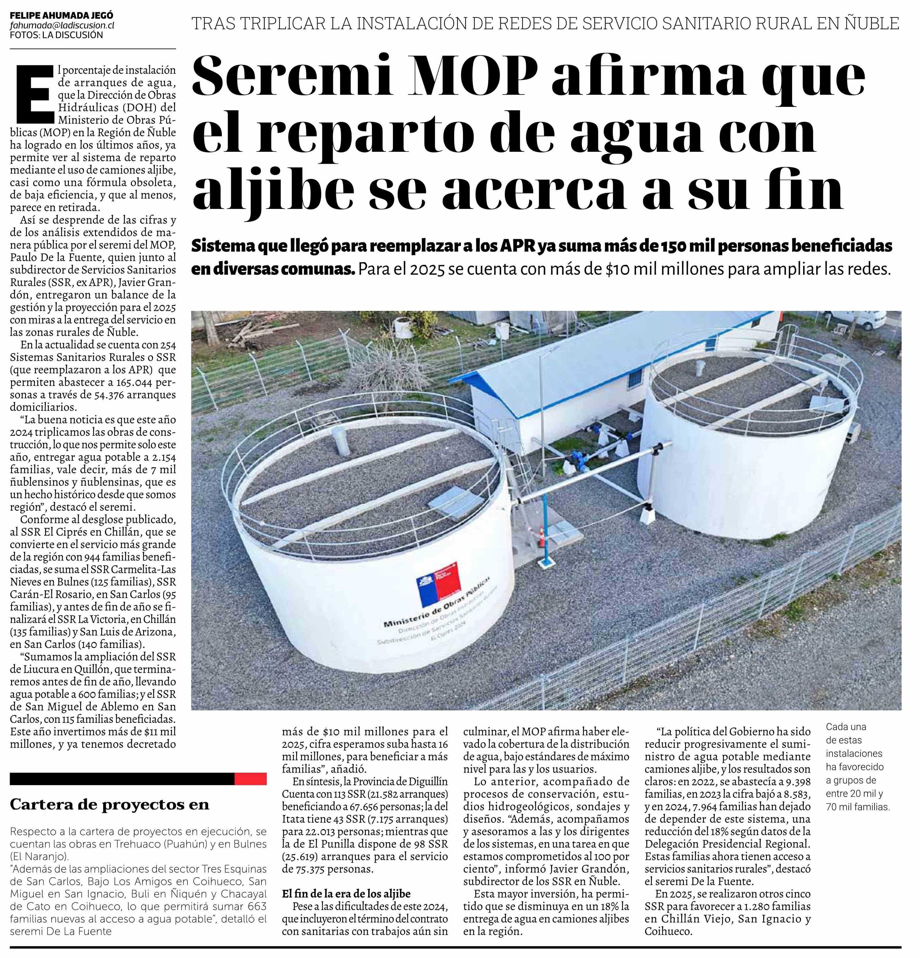 Seremi MOP afirma que el reparto de agua con aljibe se acerca a su fin 09-10-2024 La Discusión |
