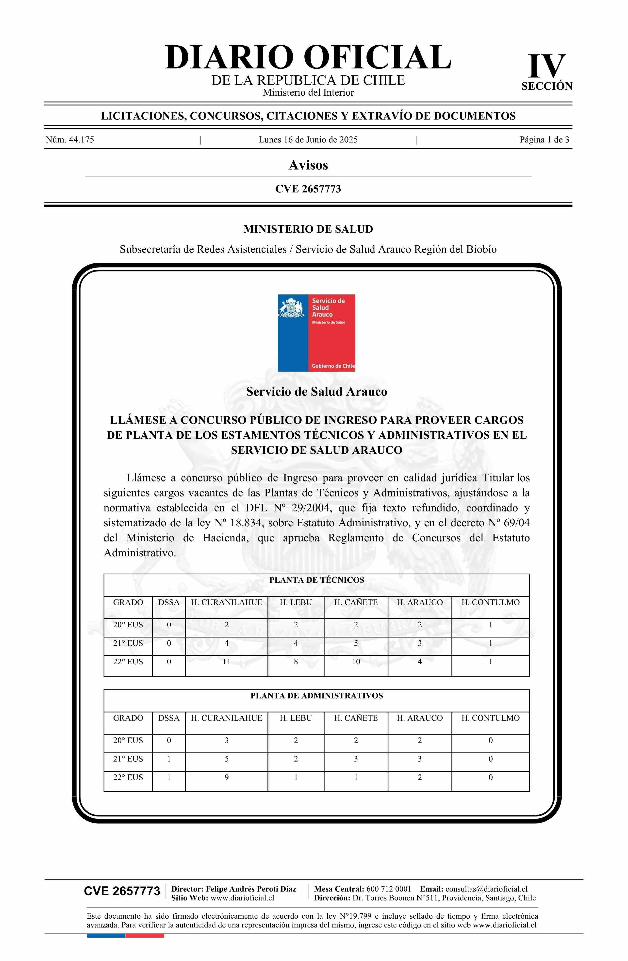 AVISO LICITACIONES: Llama a concurso público de ingreso para proveer cargos de planta de los estamentos técnicos y administrativos en el Servicio de Salud Arauco 16-06-2025 Diario Oficial Edición Electrónica |