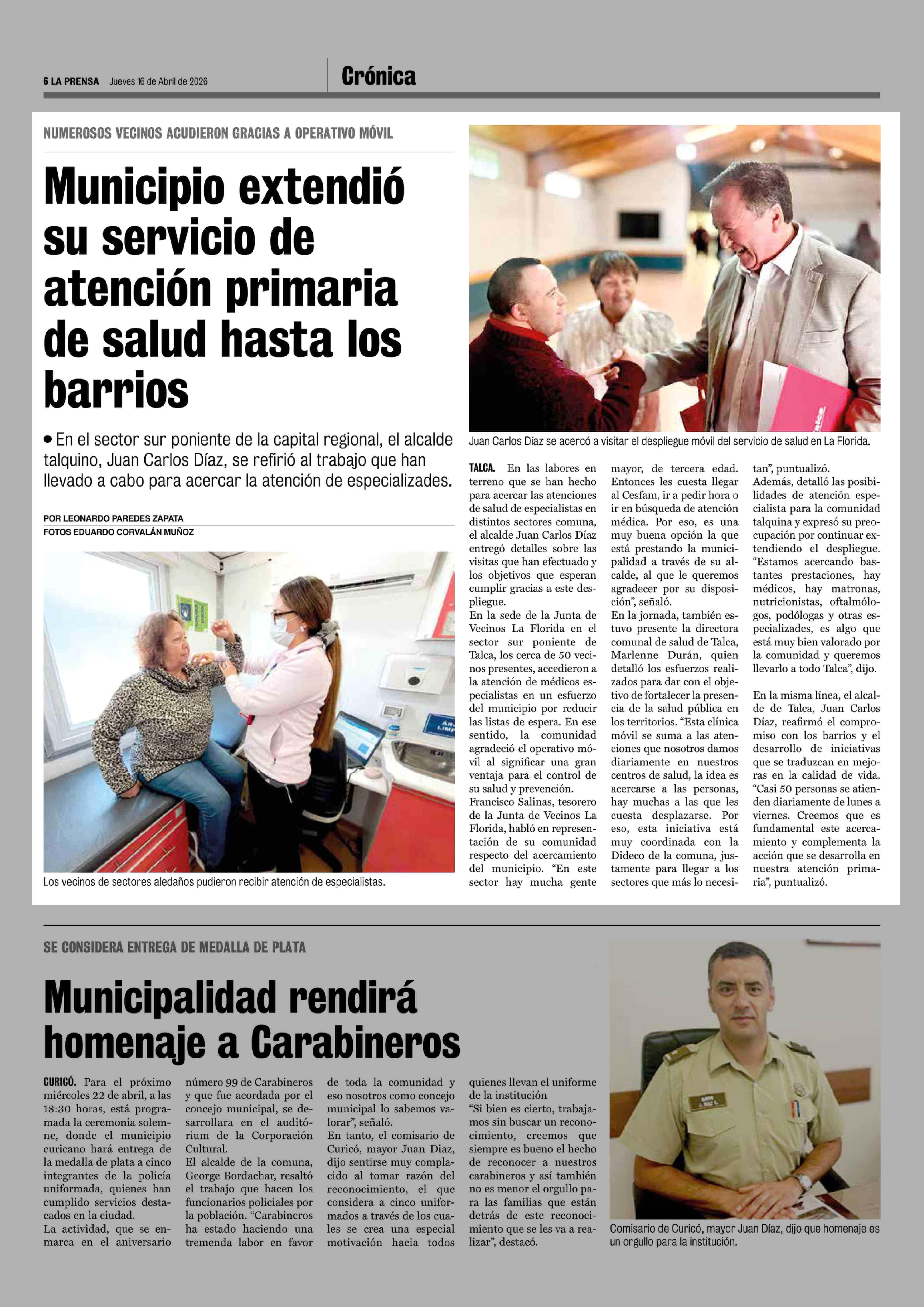 Municipio extendió su servicio de atención primaria de salud hasta los barrios 16-04-2026 La Prensa de Curicó |